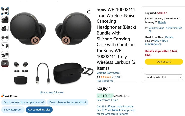 Sony WF-1000XM4 wireless Noise-cancelling ear buds.