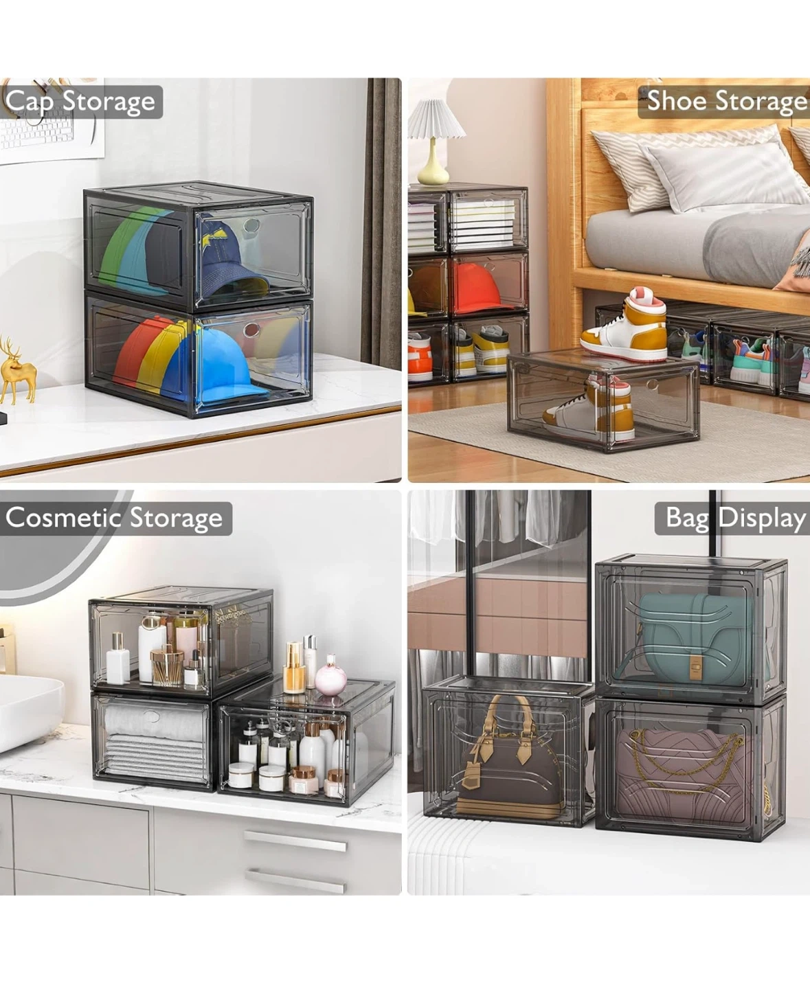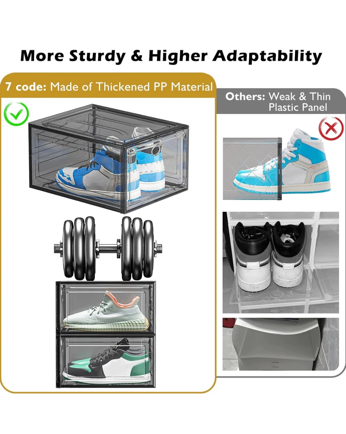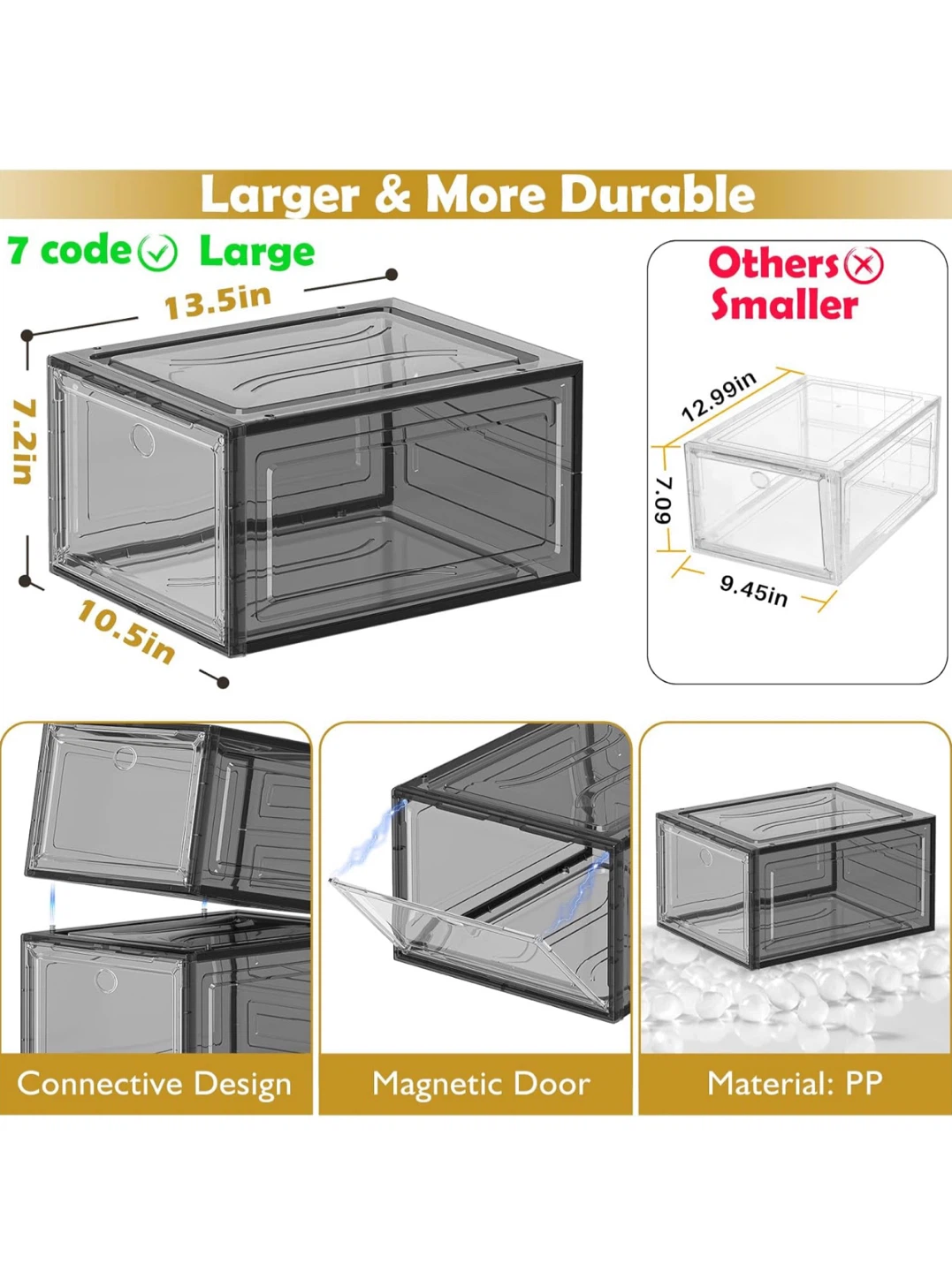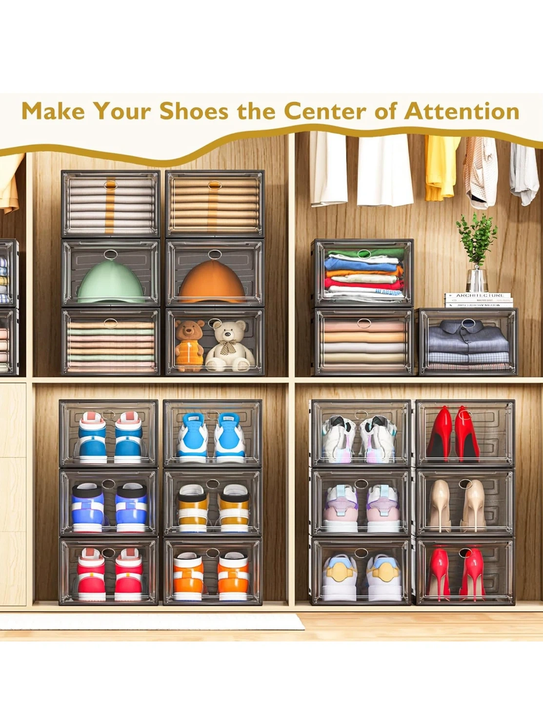 Thicken & Sturdy Clear Shoe Storage Organizer with Magnetic Door, Stackable Boxes for Closet, Foldable Space-Saving Shoe Rack for Sneaker Boot Container, Plastic Shoe Box 6 Pack, Black