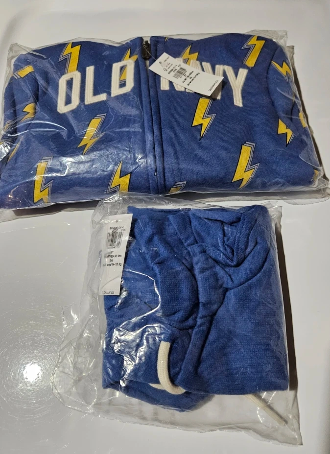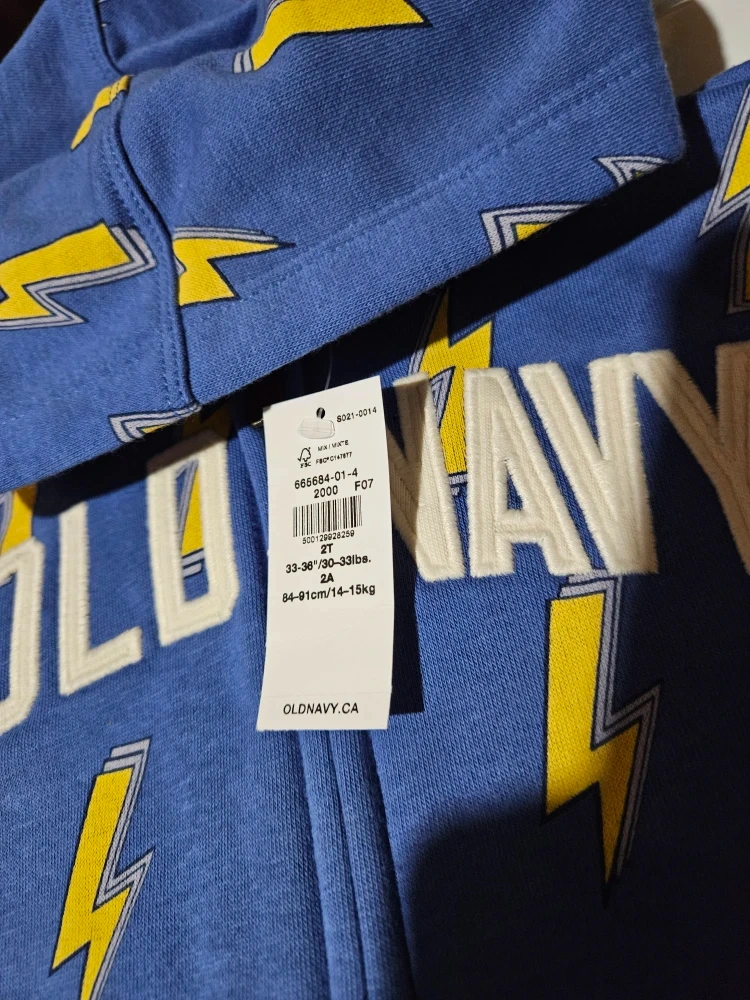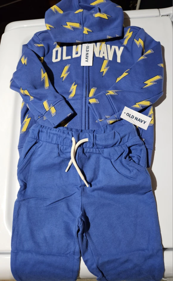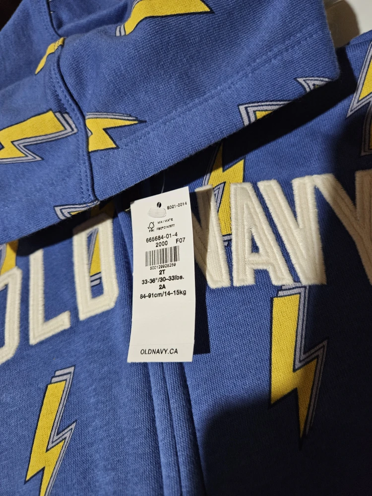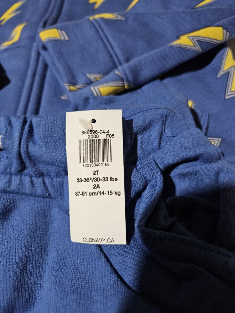 I'm selling a brand new Old Navy outfit for a toddler. It's size 2T and features a fun lightning bolt pattern! The tag says it fits 33-36"/30-33 lbs or 84-91 cm/14-15 kg. East mountain pickup. Cash only.