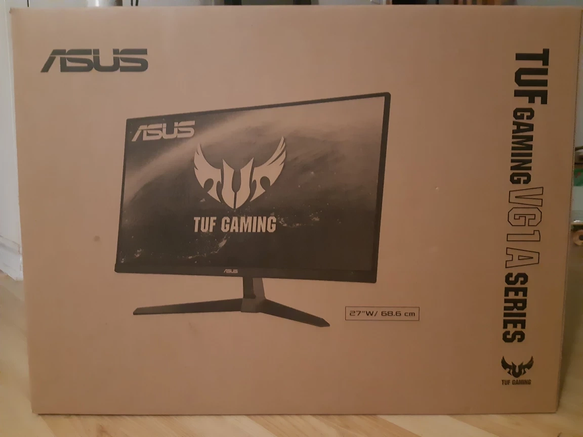 Selling an ASUS TUF Gaming VG1A Series monitor. The box indicates it's a 27-inch monitor (27"W/68.6 cm). It's in its original box, ready for a new home!