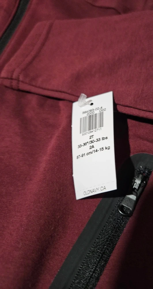 Selling a brand new with tags Old Navy Active hoodie in size 2T. It's a lovely burgundy colour and ready for your little one! The tag indicates it fits children 33-36" / 30-33 lbs or 87-91 cm / 14-15 kg. Pick up east mountain. Cash only.