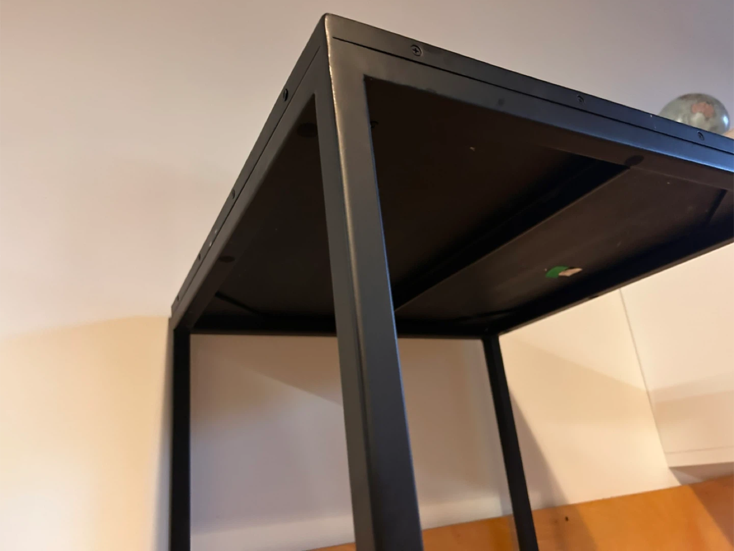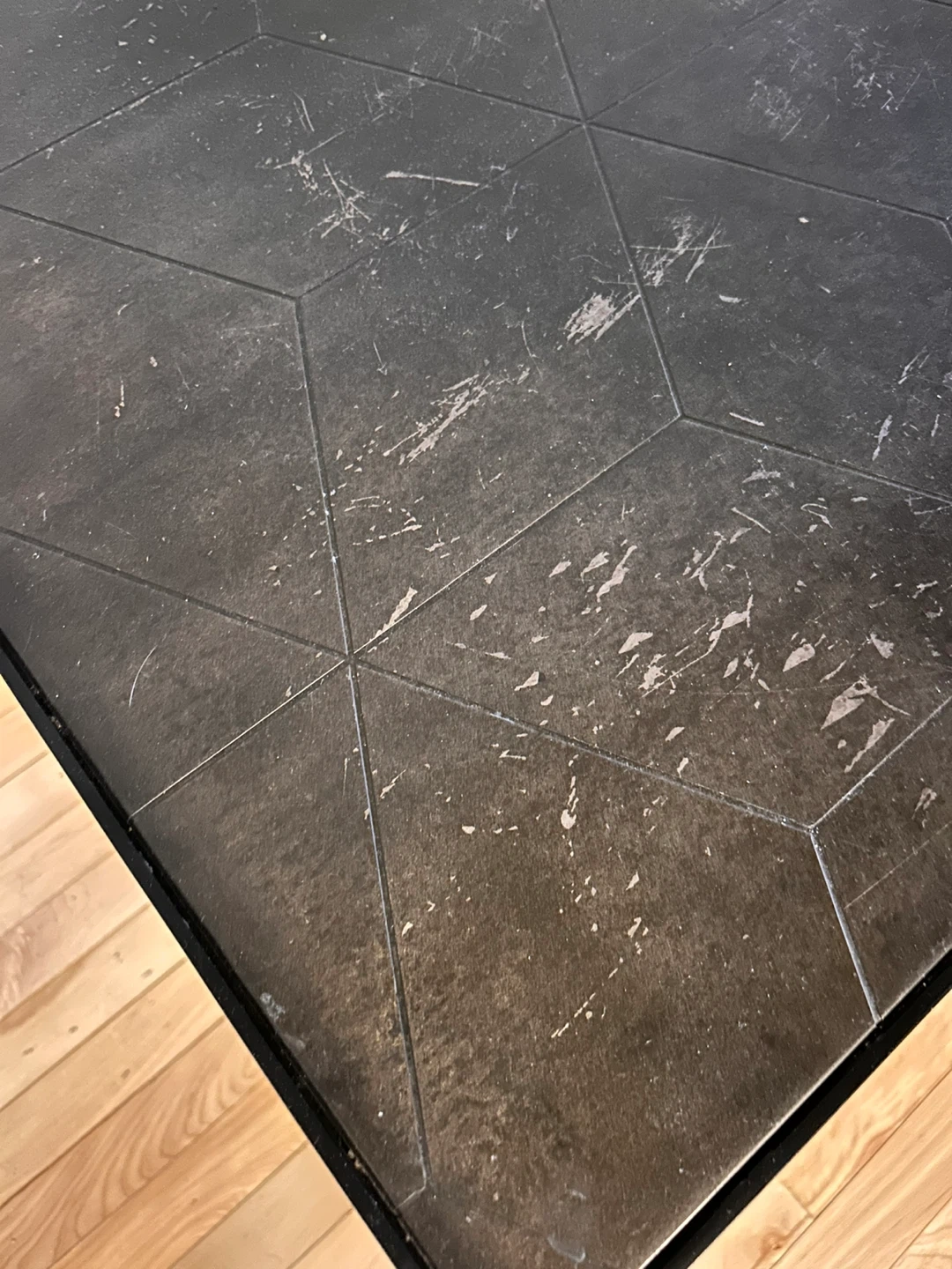 Selling a side table with a black metal frame. The top has a unique geometric pattern, adding a touch of modern style to any room. There are some signs of wear on the surface, as shown in the photos, but it's still a functional and sturdy piece of furniture!