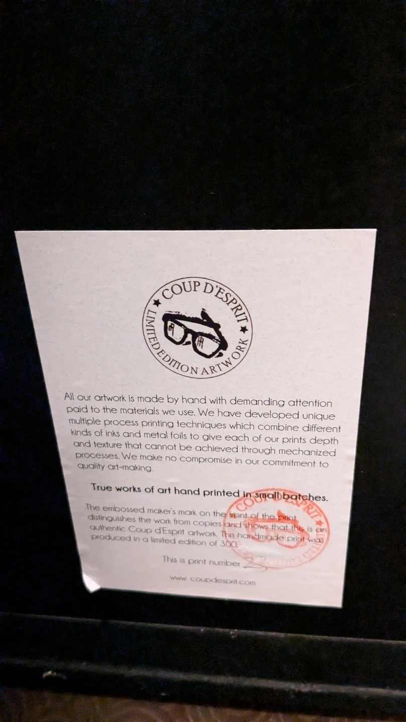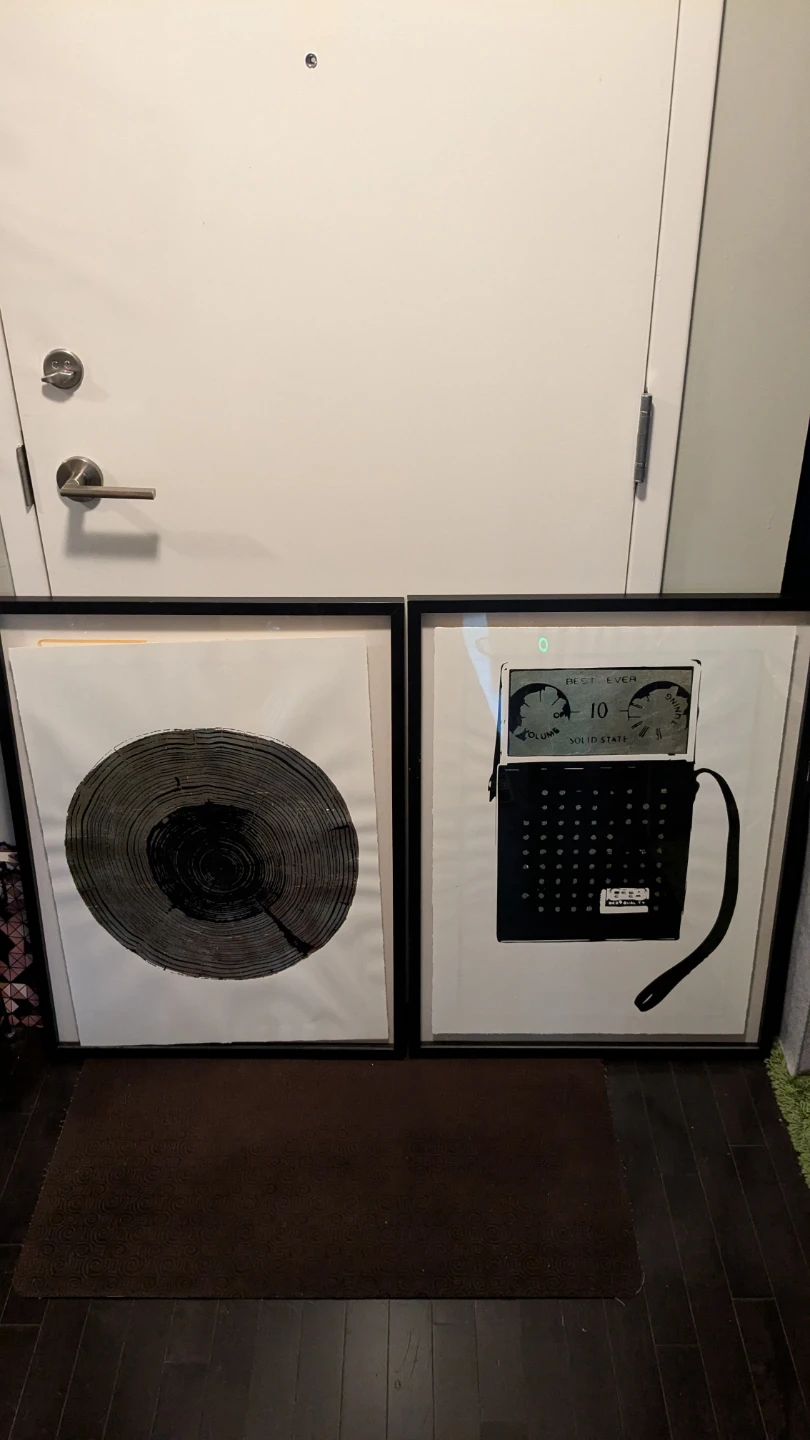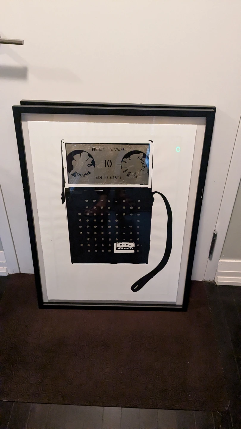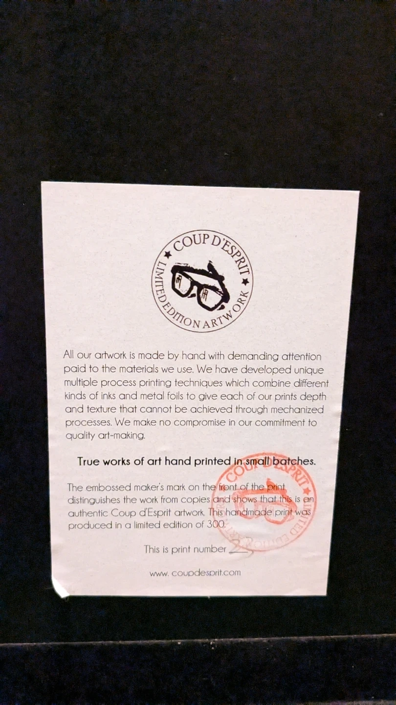 Selling 2 framed art printd by Coup d'Esprit. The print features a vintage radio design. It's a limited edition artwork, hand-printed in small batches. The print number is visible on the certificate of authenticity. Perfect for adding a unique touch to your home decor!