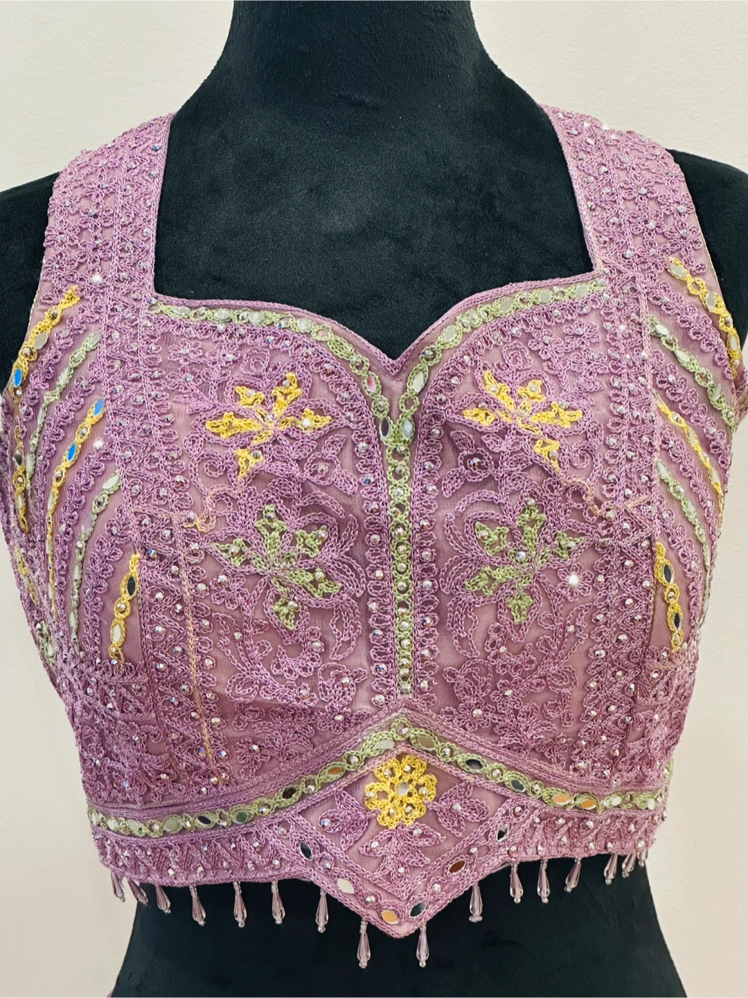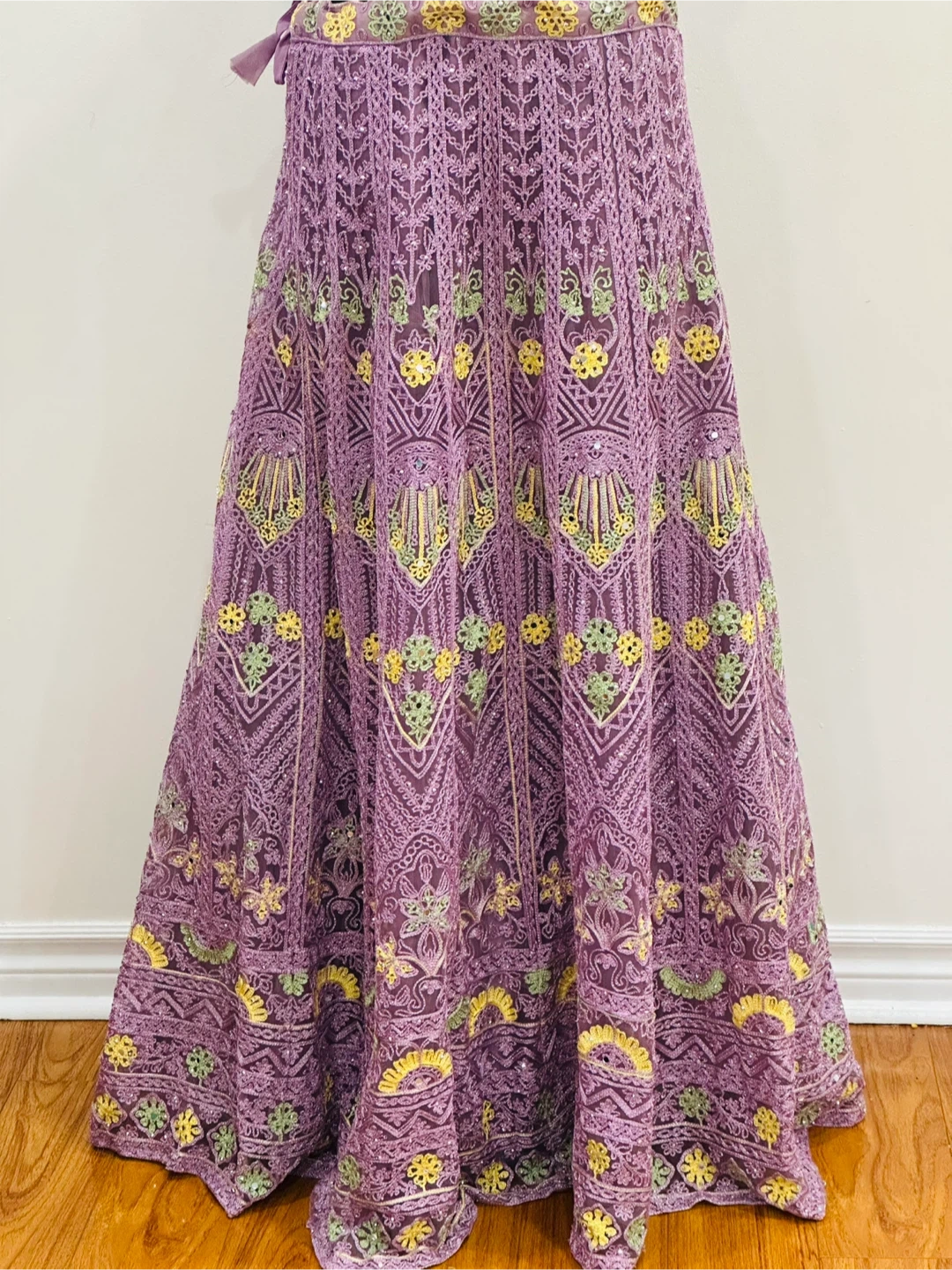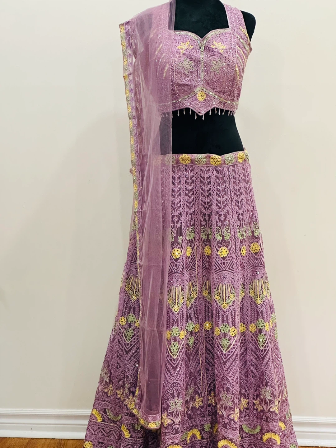 Selling a beautiful purple lehenga choli set! It features intricate embroidery and detailing throughout the top and skirt. This set is perfect for special occasions and celebrations. The material feels high-quality and comfortable