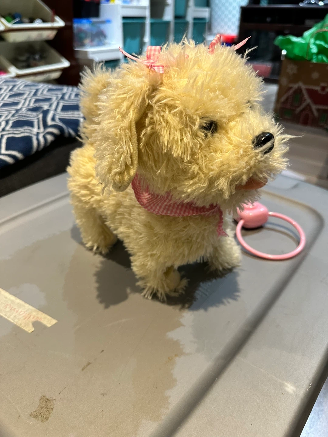 Selling a cute walking toy dog! It's a fuzzy, light-yellow colour and comes with a pink remote control to make it walk and bark. Perfect as your kids first pet.