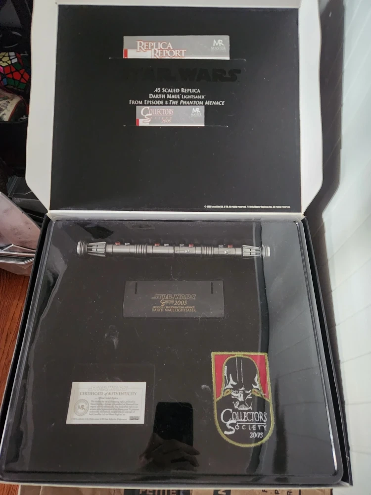 Selling a Darth Maul lightsaber .45 scaled replica from Episode I: The Phantom Menace! It's in great condition and comes with the box and certificate of authenticity