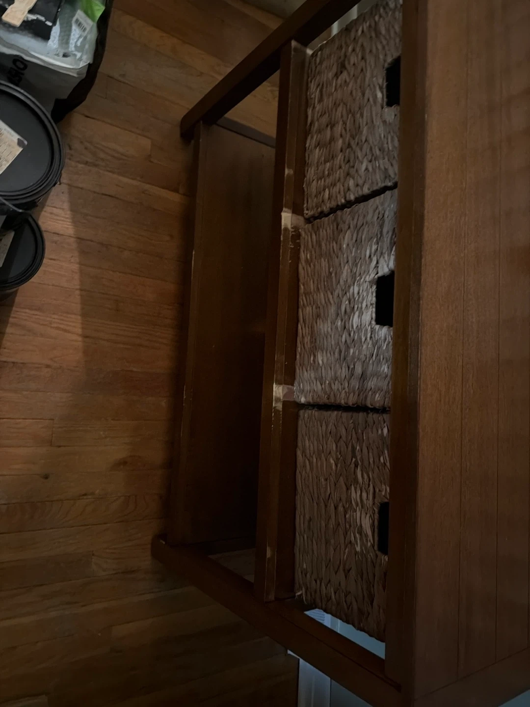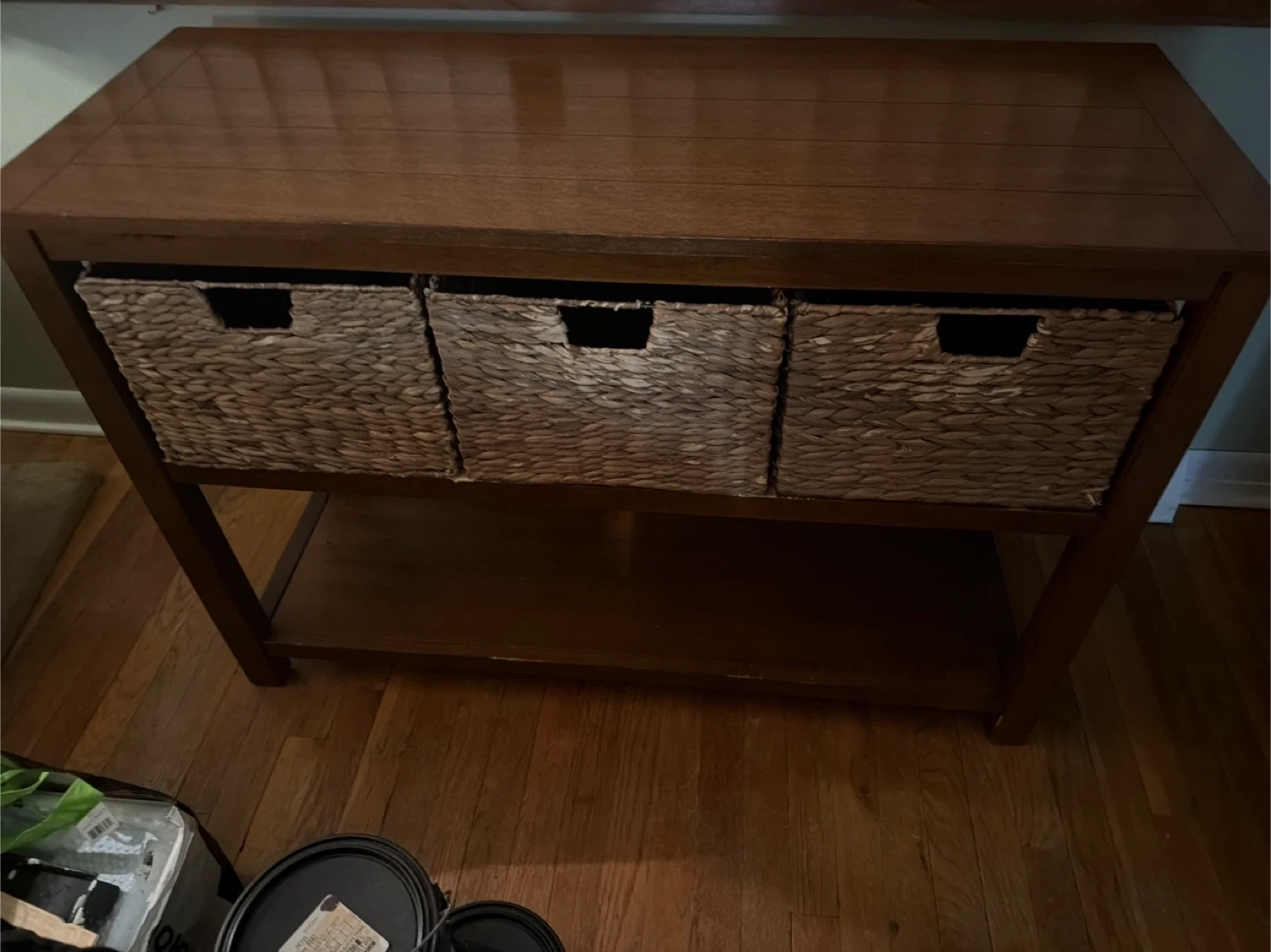 This is a charming wooden console table, perfect for adding a touch of rustic elegance to your home. It features three woven wicker baskets that provide ample storage space. The table has a warm, brown tone that complements a variety of decor styles. It's in great condition and ready to enhance your living space! The only part that needs TLC is where the baskets get pulled out-under them-