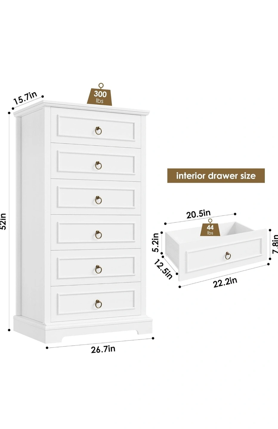HOSTACK 6-Drawer White Tall Dresser – 52” Modern Farmhouse Stora