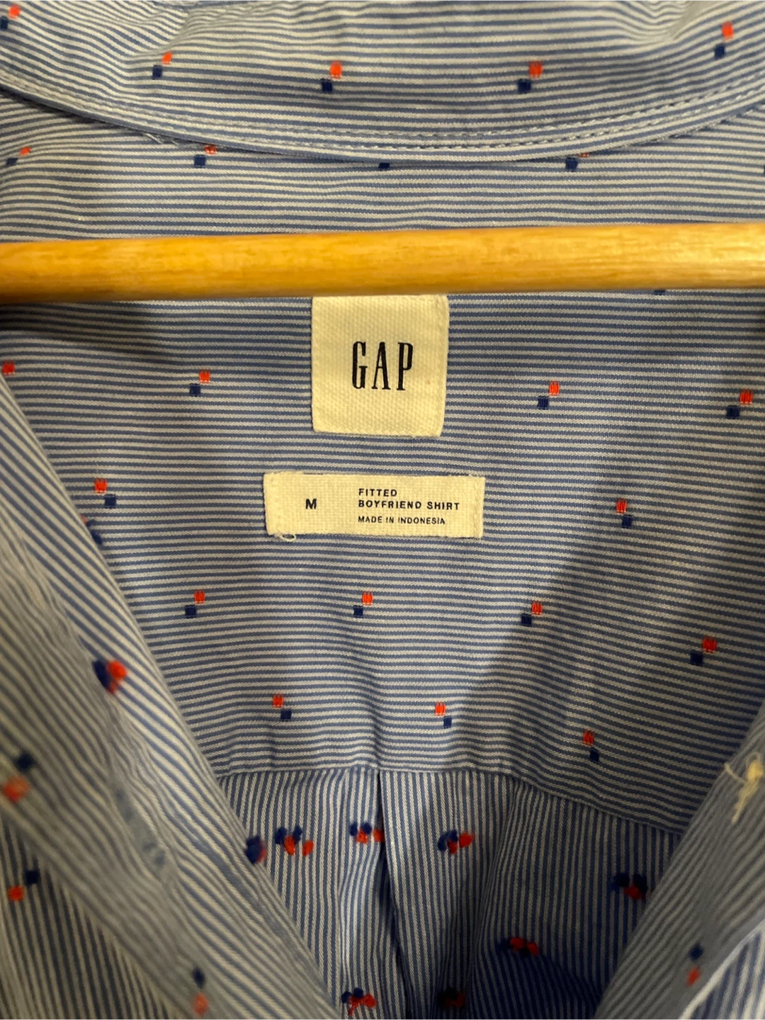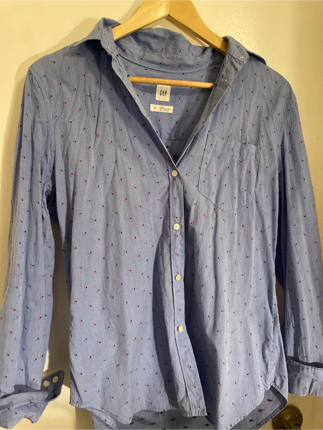 Here's a cute GAP fitted boyfriend shirt in size medium! It's a light blue colour with a subtle pattern. Perfect for a casual, relaxed look!