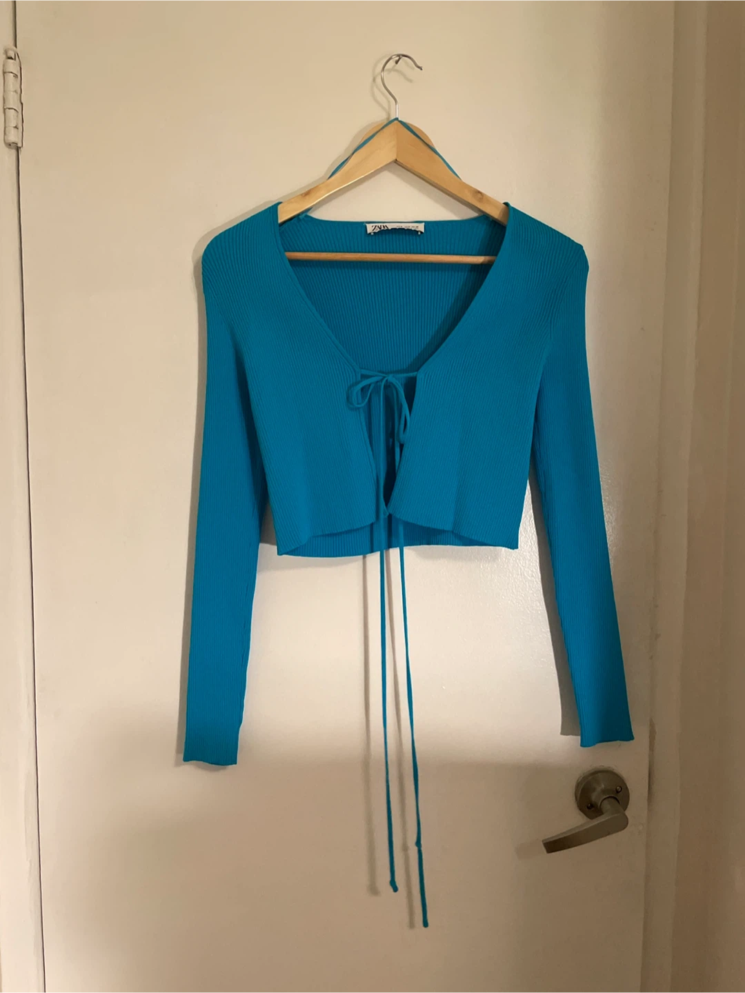 Selling a cute Zara tie-front cardigan in a vibrant blue! It's a size medium and in great condition. Perfect for layering or wearing on its own. The tie detail adds a stylish touch to any outfit! Never worn. Perfect condition.