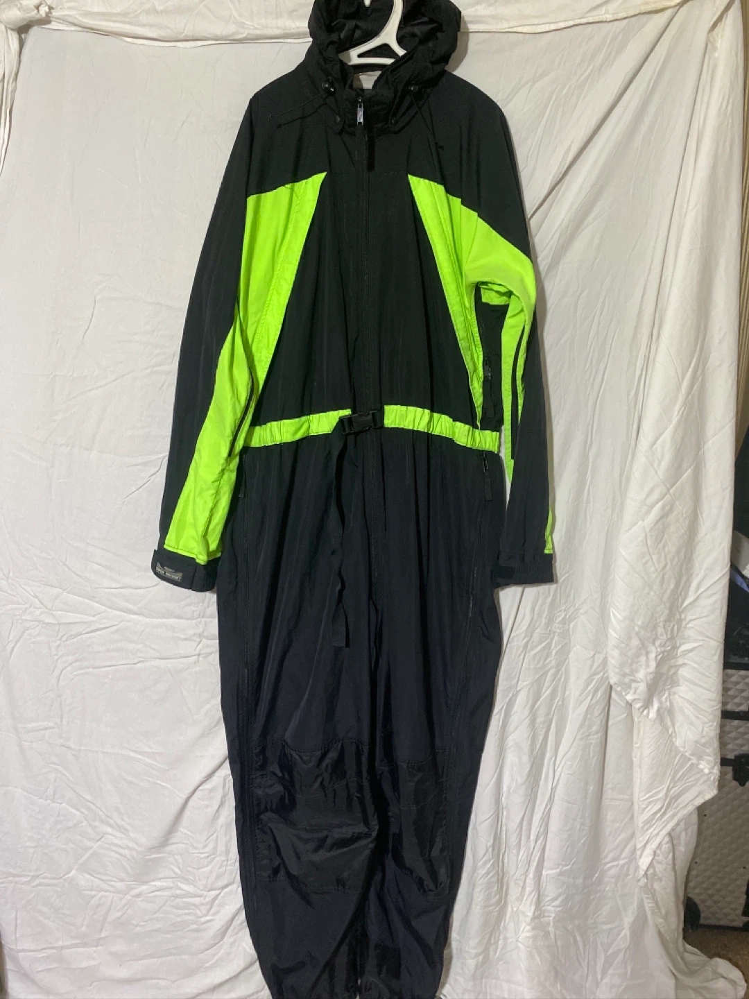 Selling an American Eagl and snow suit in black with neon green accents. Perfect for staying warm and visible on the slopes! It features a hood and a belted waist.
