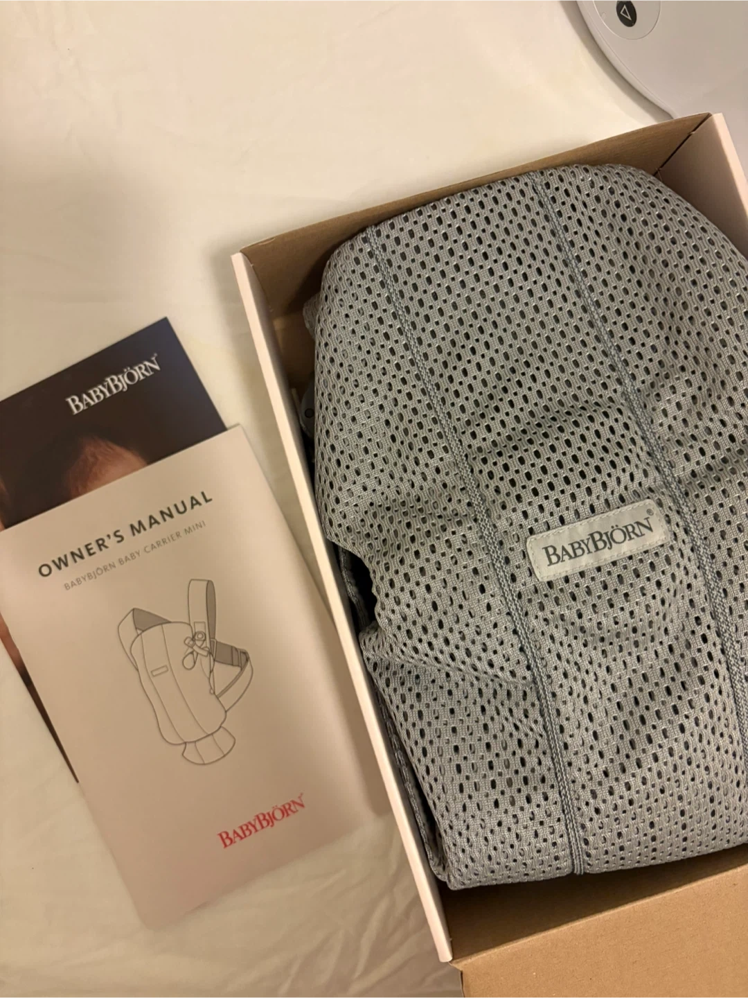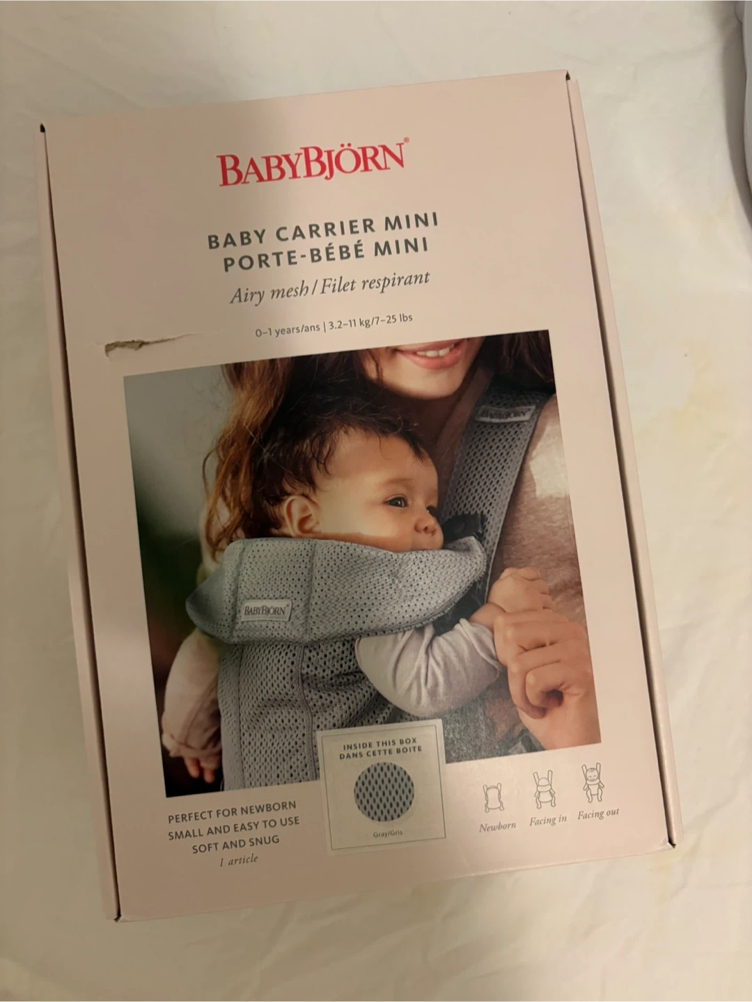 Selling a gently used BabyBjörn Baby Carrier Mini in airy mesh material! It's perfect for newborns and small babies, with a recommended weight range of 3.2-11 kg (7-25 lbs). The carrier is designed to be small, easy to use, soft, and snug. The box and owner's manual are included!