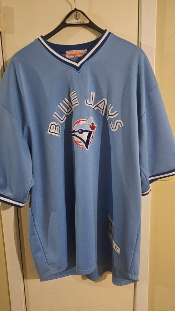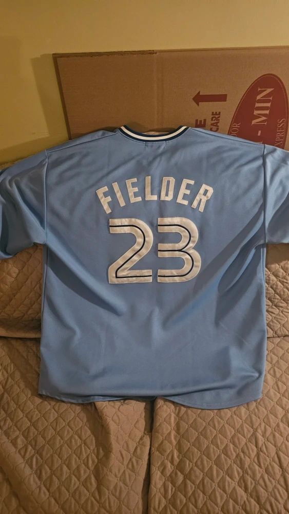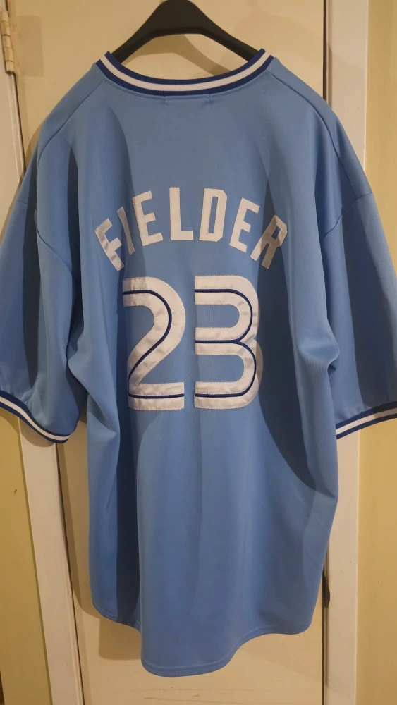 Selling a Mitchell & Ness Toronto Blue Jays jersey, featuring Cecil Fielder's name and number 23. It's a light blue colour, size 3XL and in great condition. Perfect for any Blue Jays fan!
