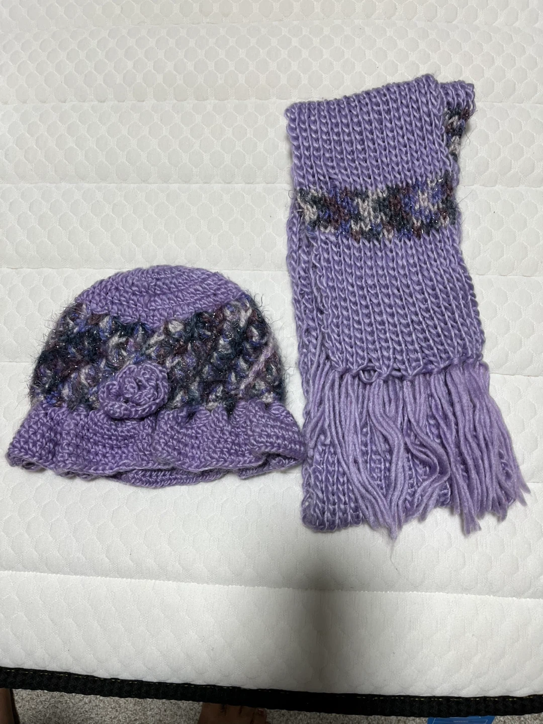 Selling a cute handmade hat and scarf set in a lovely shade of purple! The hat has a unique design with a flower detail, and the scarf has fun fringe. Perfect for keeping warm and stylish during the colder months