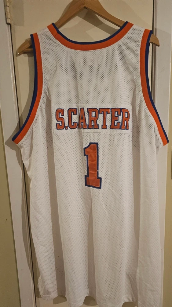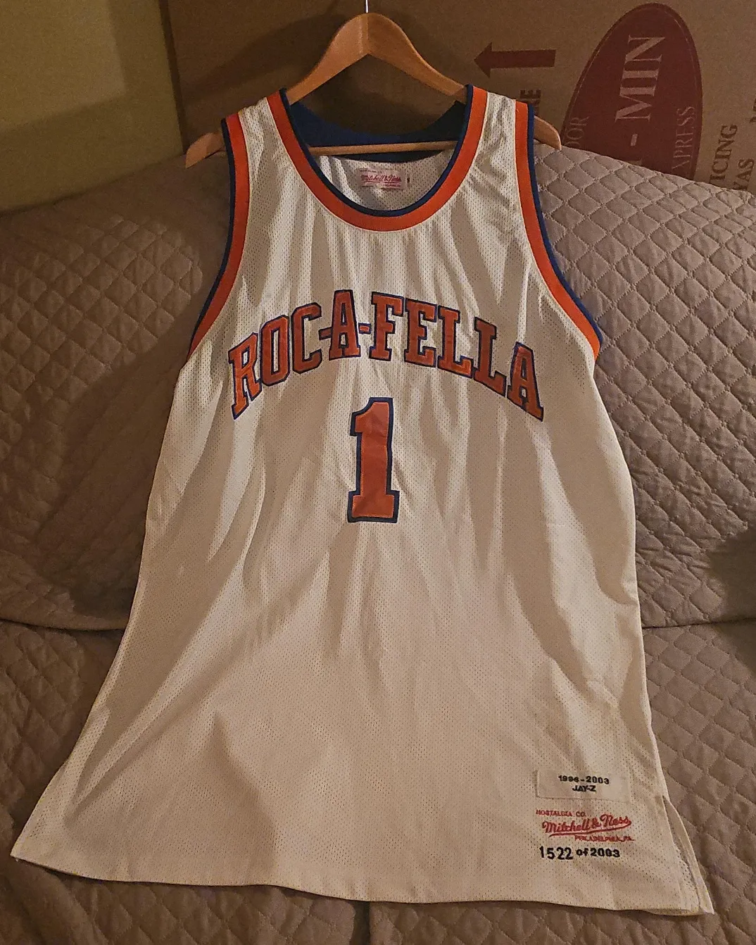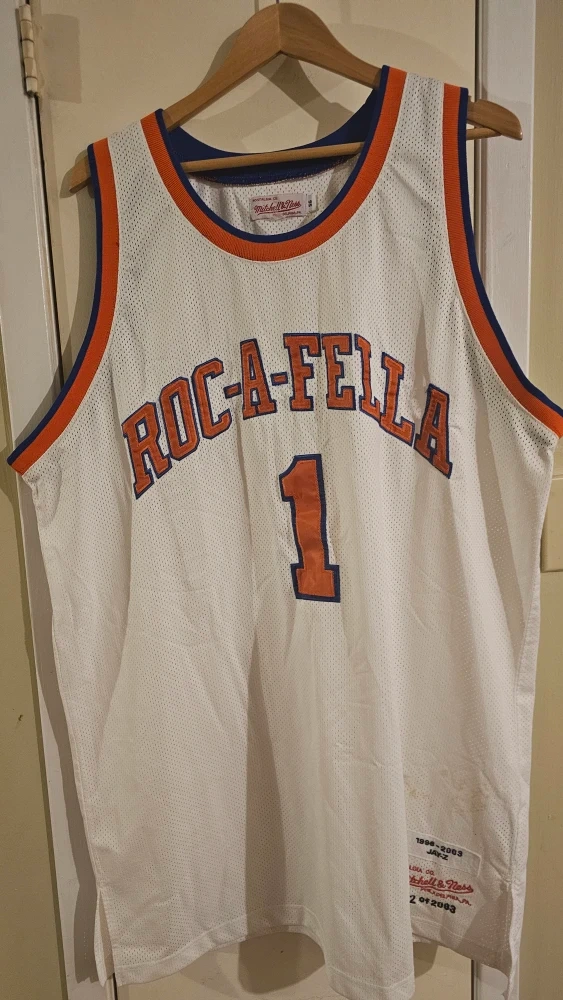 Selling a Mitchell & Ness Roc-A-Fella jersey. It's a white, Knicks-inspired jersey with the number 1 on it. The jersey also has orange and blue trim around the neck and armholes. It's from the 1994-2003 Jay-Z collection and is number 1522 of 2003.