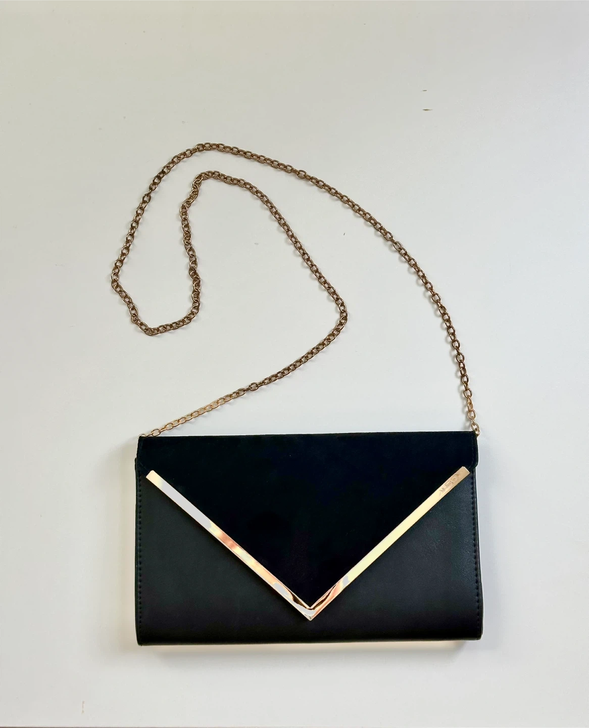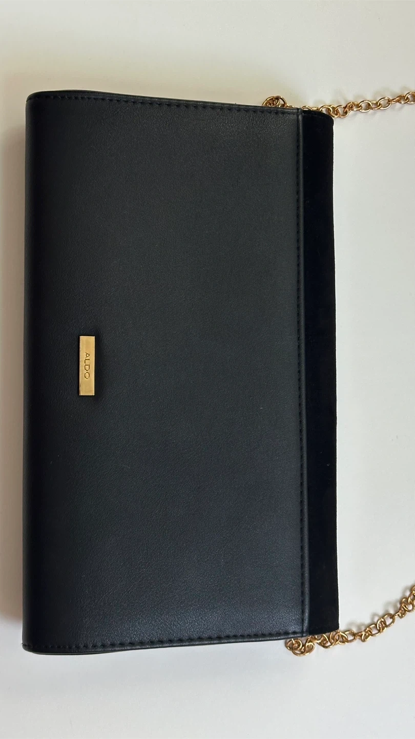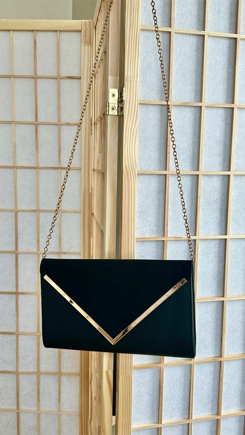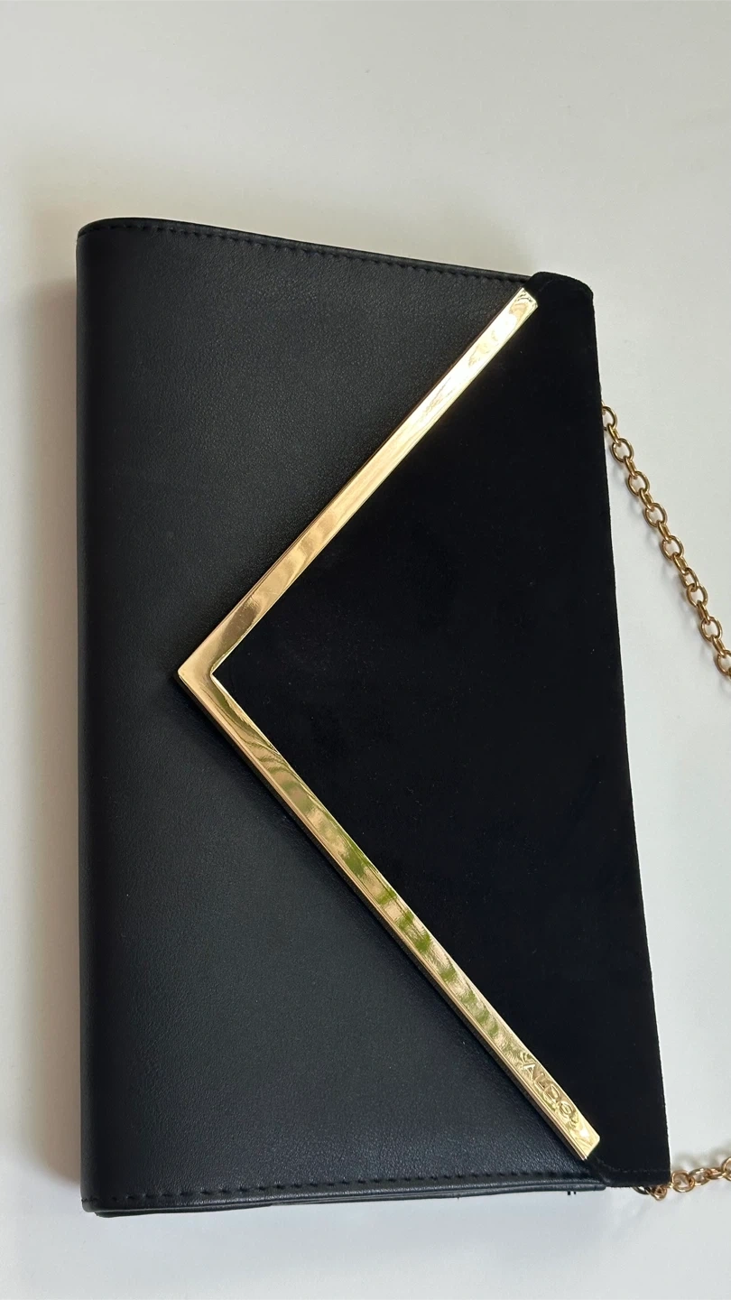 Selling a stylish black clutch from ALDO! It features a sleek design with a gold chain strap, perfect for evenings out or special occasions. The clutch has a unique V-shaped gold accent on the front. It's in great condition and ready for a new owner.