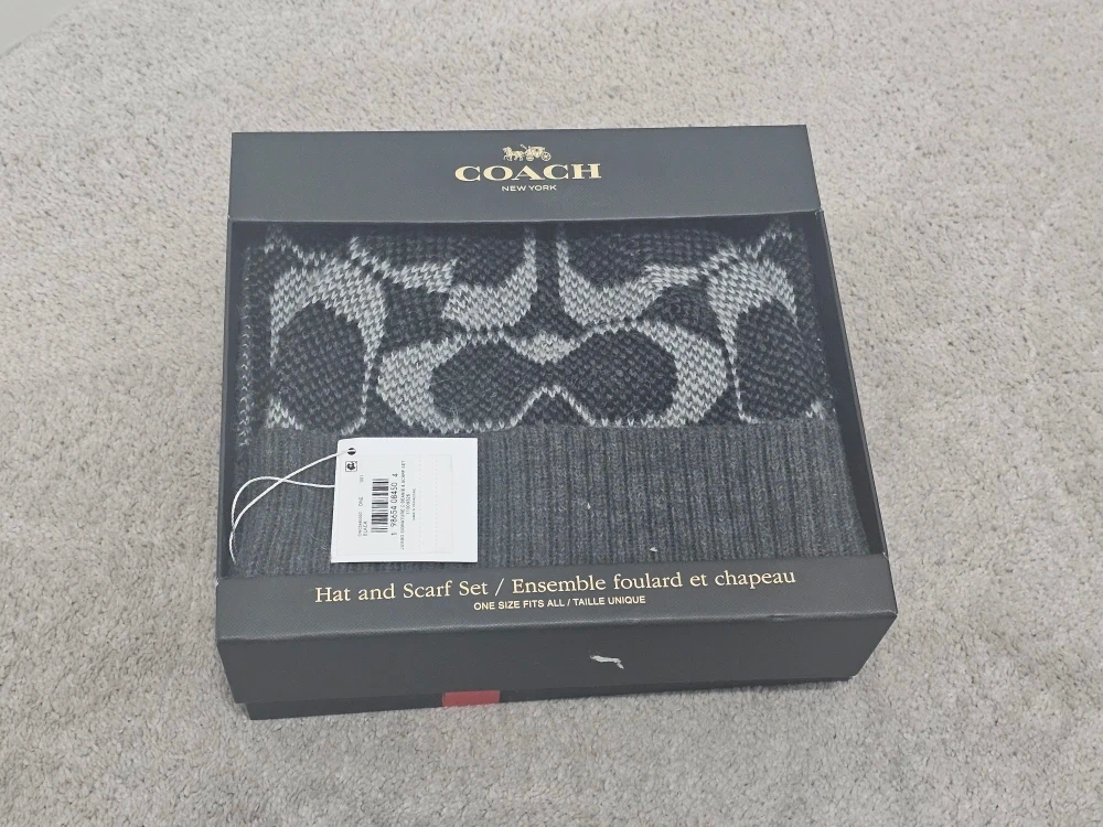 Selling a COACH hat and scarf set! It's a stylish set that includes both a hat and a scarf, perfect for keeping warm and fashionable. The set is one size fits all. It also comes with the original box!