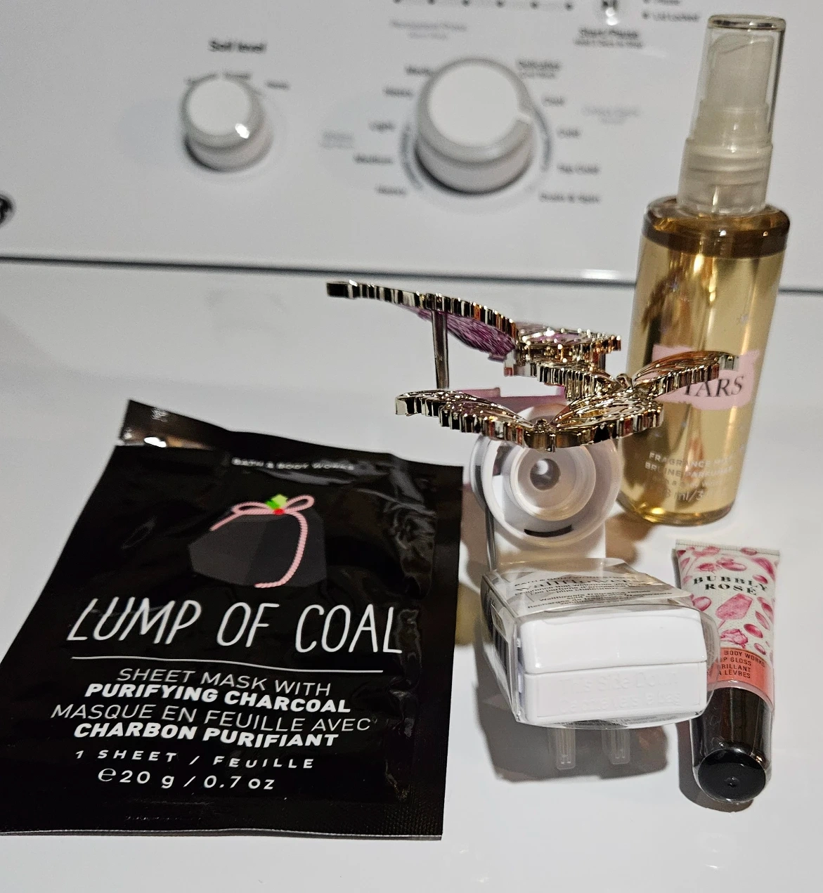 Selling a bundle of Bath & Body Works goodies! Includes a 'Lump of Coal' sheet mask, 'In the Stars' fragrance mist, a butterfly wallflower holder, and a Berry Rose lip gloss