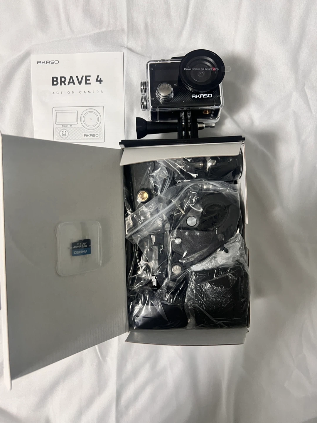 Selling an AKASO Brave 4 Action Camera in excellent condition! It comes with all the original accessories and the box. This camera is perfect for capturing all your adventures. Retails for $139.99 with the 64GB U3 card. Get ready to shoot amazing photos and videos!