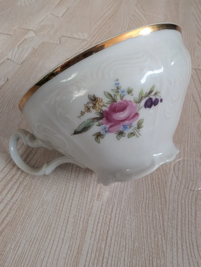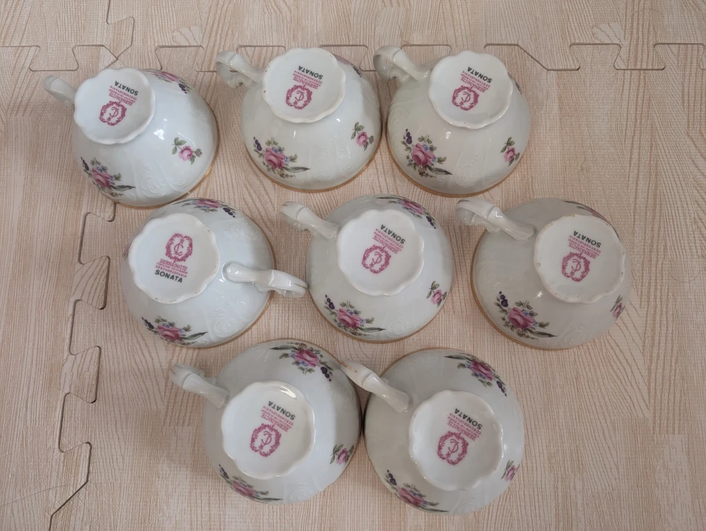 Selling a set of eight Bernadotte Sonata tea cups. These are porcelain fine de Bohème from Czechoslovakia. Each cup features a delicate floral design with a gold rim. They are in good condition and ready to be enjoyed!