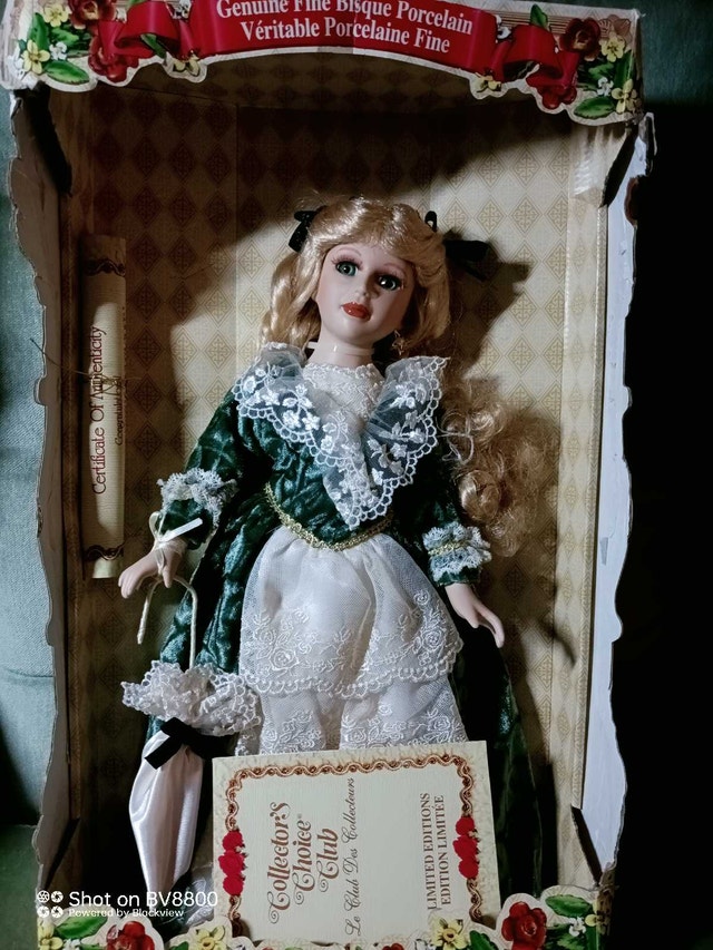 This is a Collector's Choice genuine fine bisque porcelain doll, still in its original box with the certificate of authenticity. This vintage doll is in excellent condition and features a beautiful green velvet dress with lace details. A great addition to any doll collection!