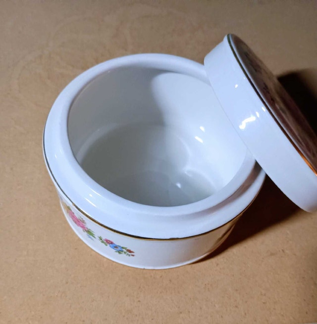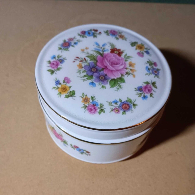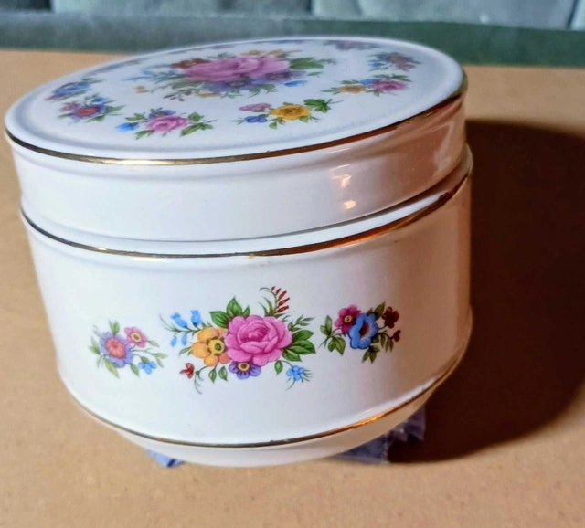 This is a Sadler trinket box, perfect for storing your most precious small items. It is in good condition, displaying a lovely floral pattern and gold trim. Due to its vintage nature, it adds a touch of elegance and history to any space. I've lovingly cared for this box, and it's ready for a new home! This vintage trinket box would look great on your bedside table, or as a gift to your mother, or any friend that has great taste. If the ad is up, it's available!