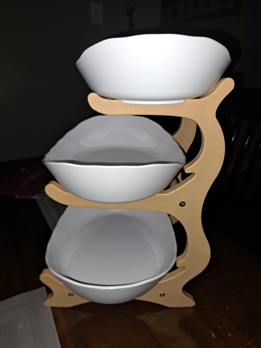 Selling a 3-tier serving stand! It's perfect for displaying snacks, desserts, or appetizers at your next gathering. The stand is in great condition and ready to use. It features three white serving bowls and a light-colored wooden frame.