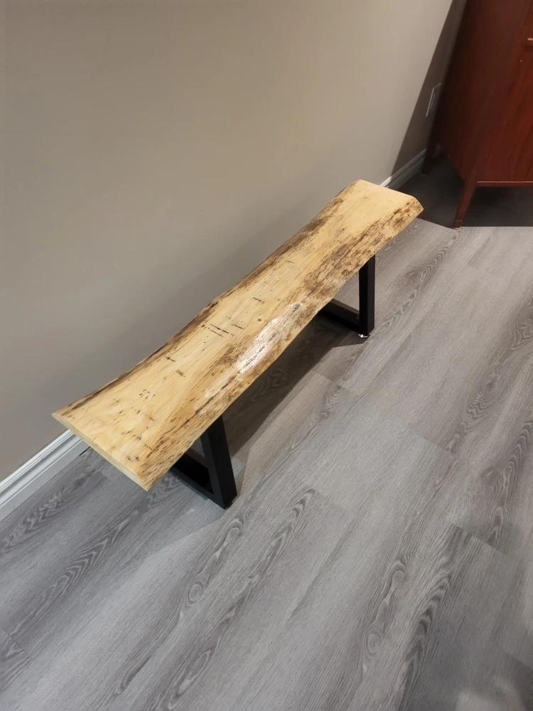 Selling a live edge wood bench with black metal legs. It's a unique piece that would look great in any entryway or living room. The bench is approximately 48 inches long, 9 inches wide, and 16 inches tall.