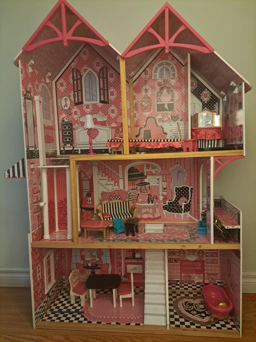 Selling a lovely dollhouse! It's pink and white and comes with several rooms and levels for lots of play. Perfect for imaginative play and doll collections