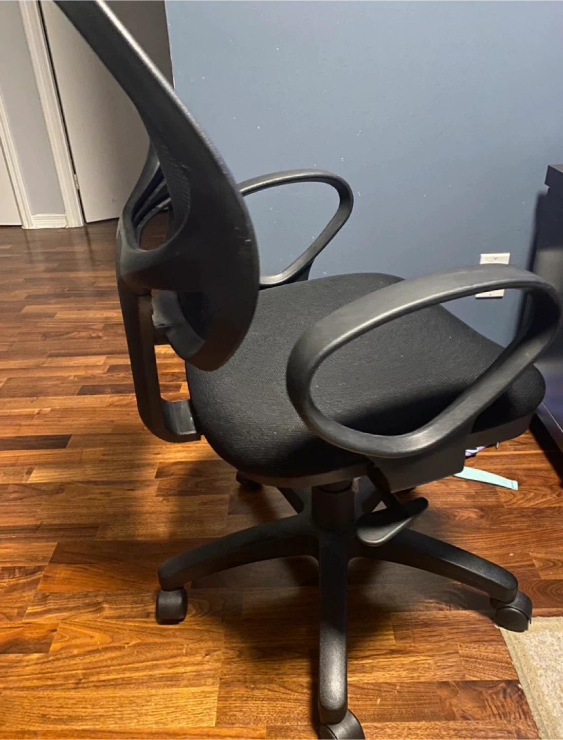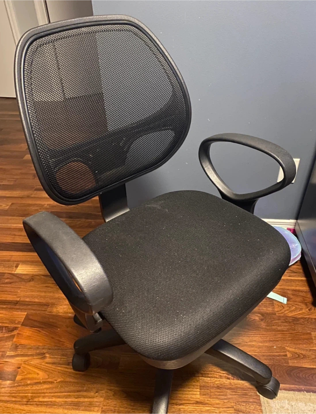 Selling a comfortable black office chair. It's in good condition and ready for a new workspace. The chair features a mesh back for breathability and adjustable arms for added comfort. Perfect for working from home or studying!