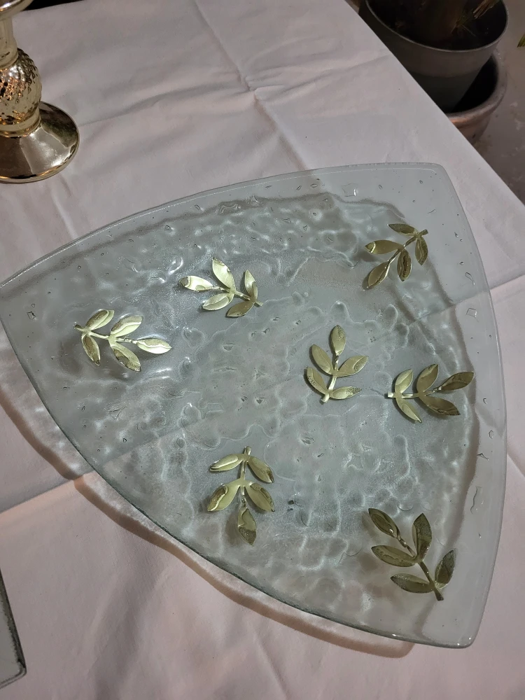 Selling a set of Large, decorative glass plates featuring a lovely gold leaf design. There's a round plate, a square plate, and a triangular plate. They're perfect for adding a touch of elegance to your home decor!
