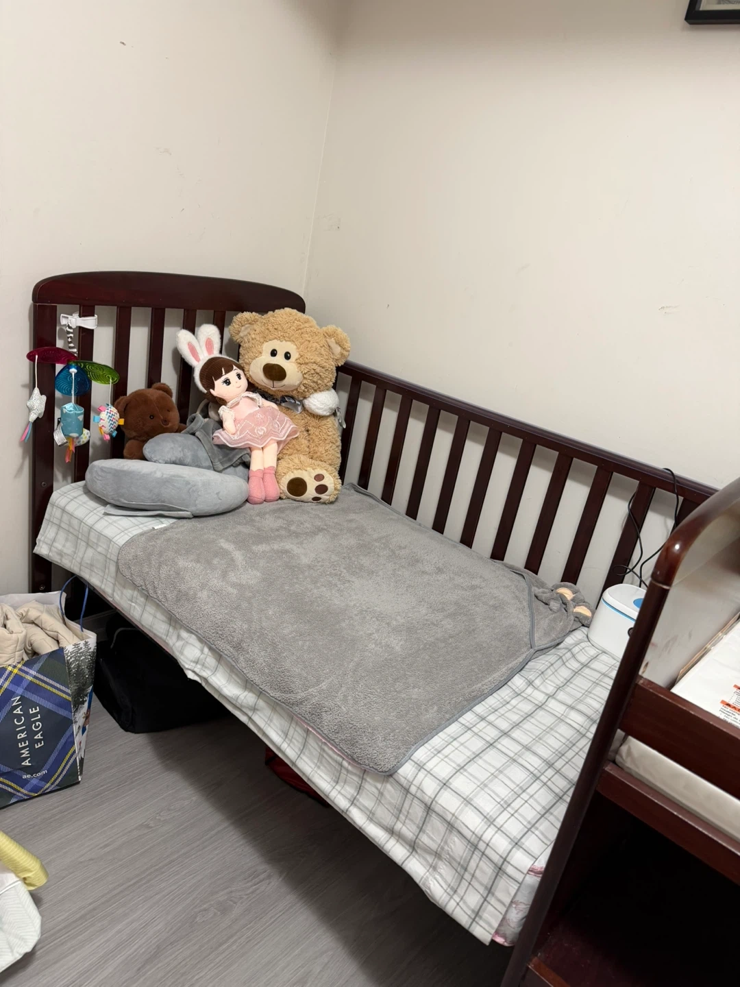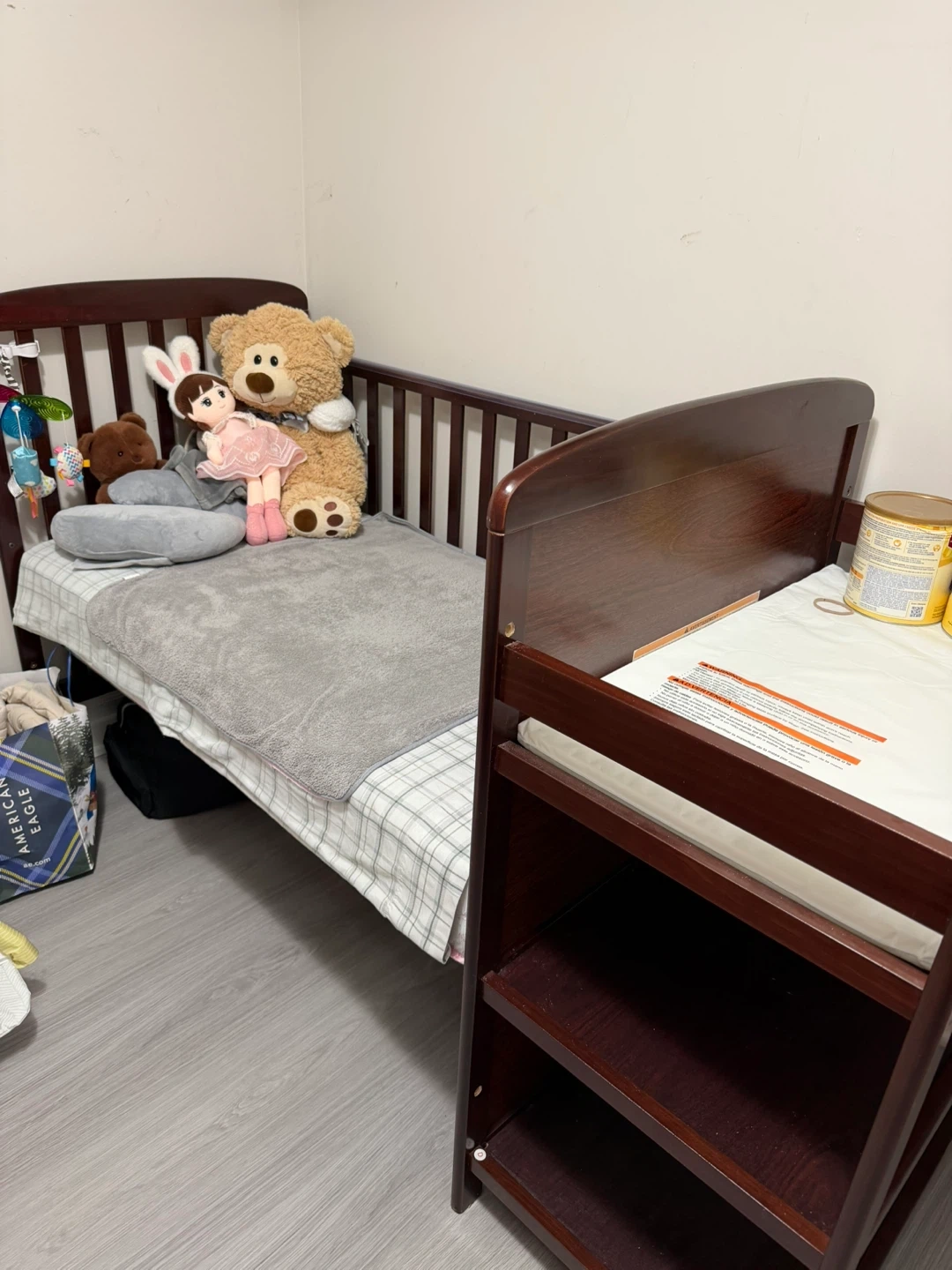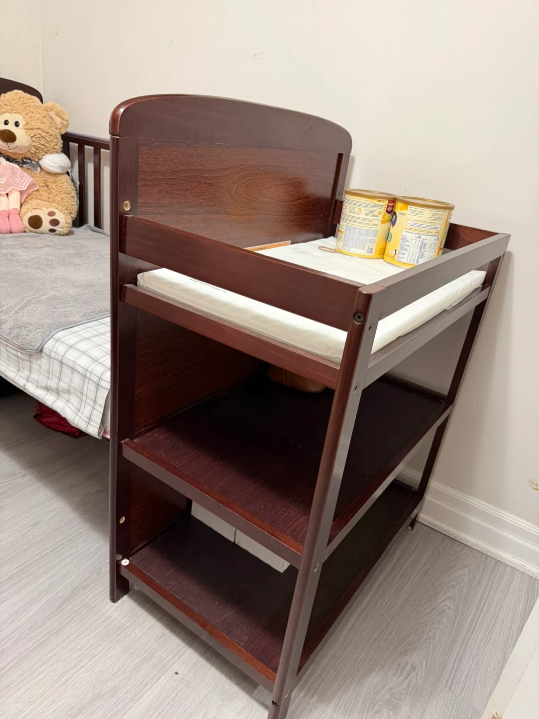Selling a gently used baby crib and changing table set. It's a sturdy and reliable set, perfect for a nursery. The changing table has shelves for storage, and the crib is a standard size. A great set for your little one!