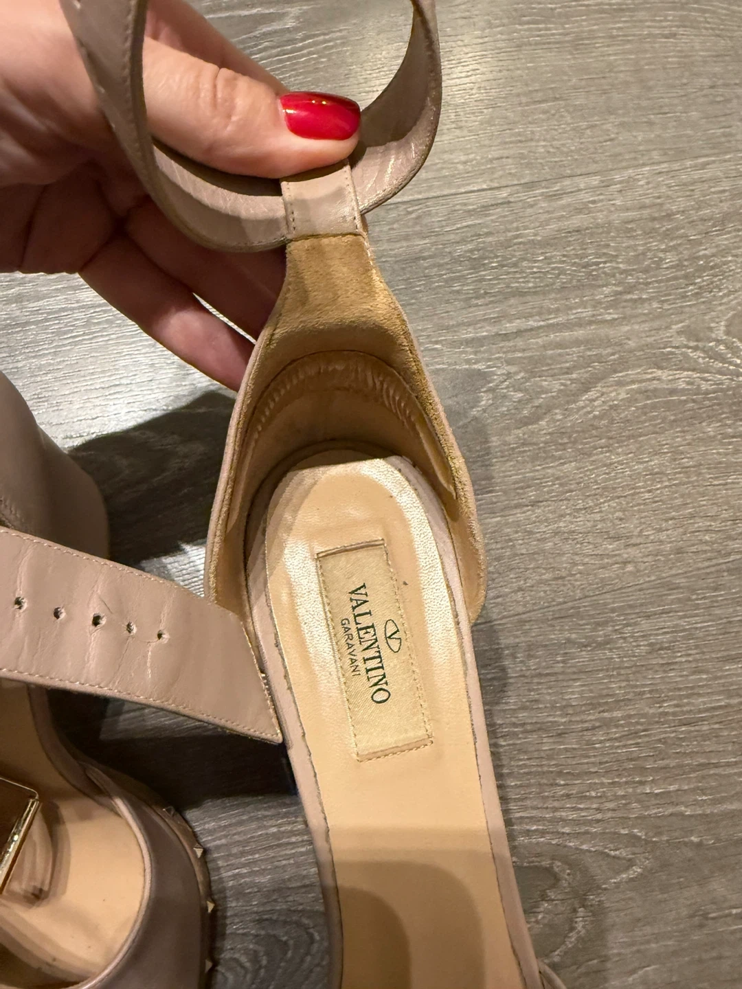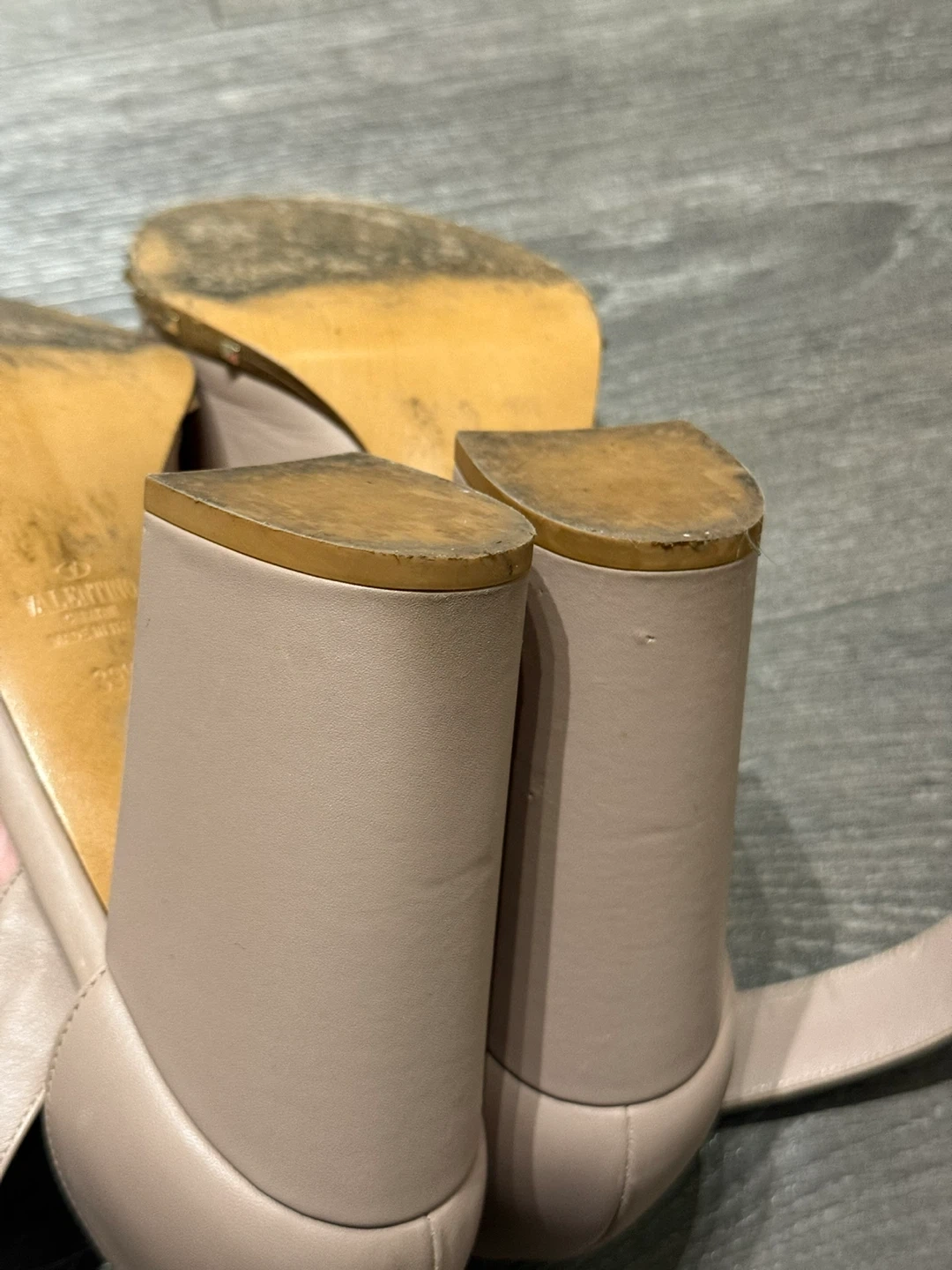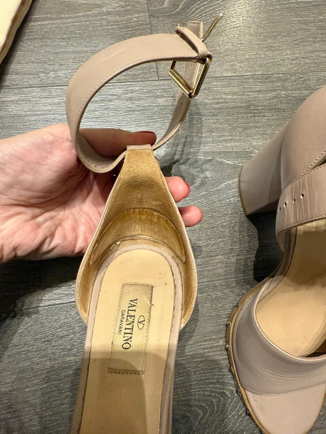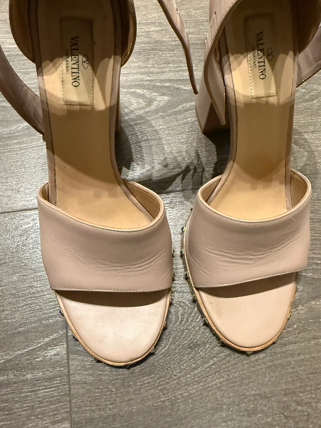 They are a beautiful light pink nude colour and have an ankle strap. They show some signs of wear.