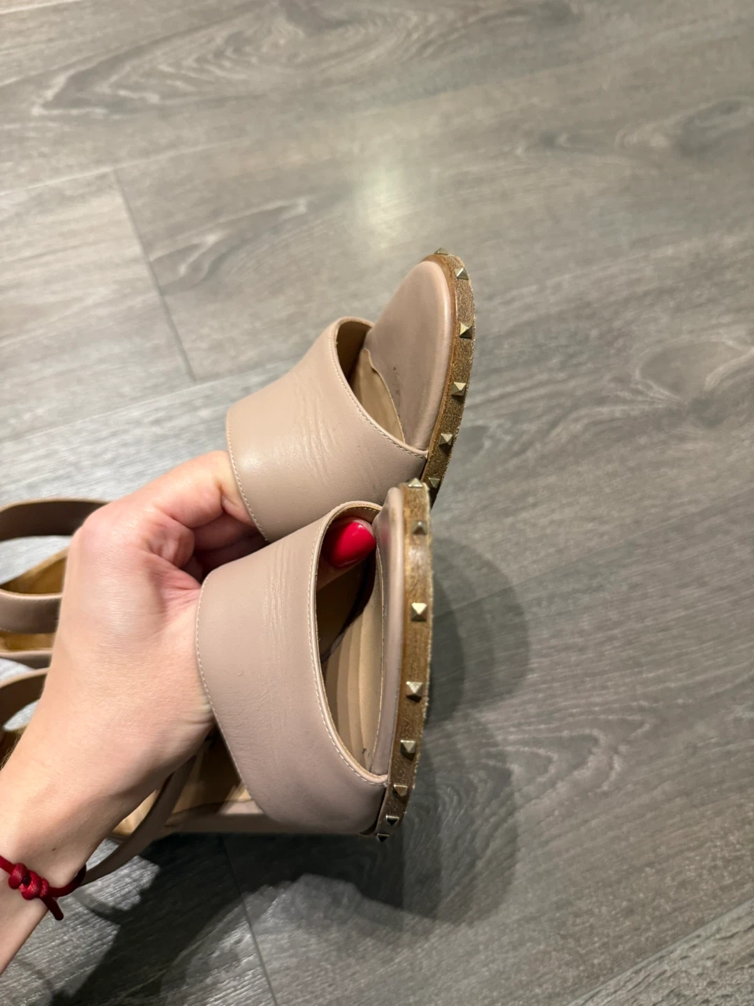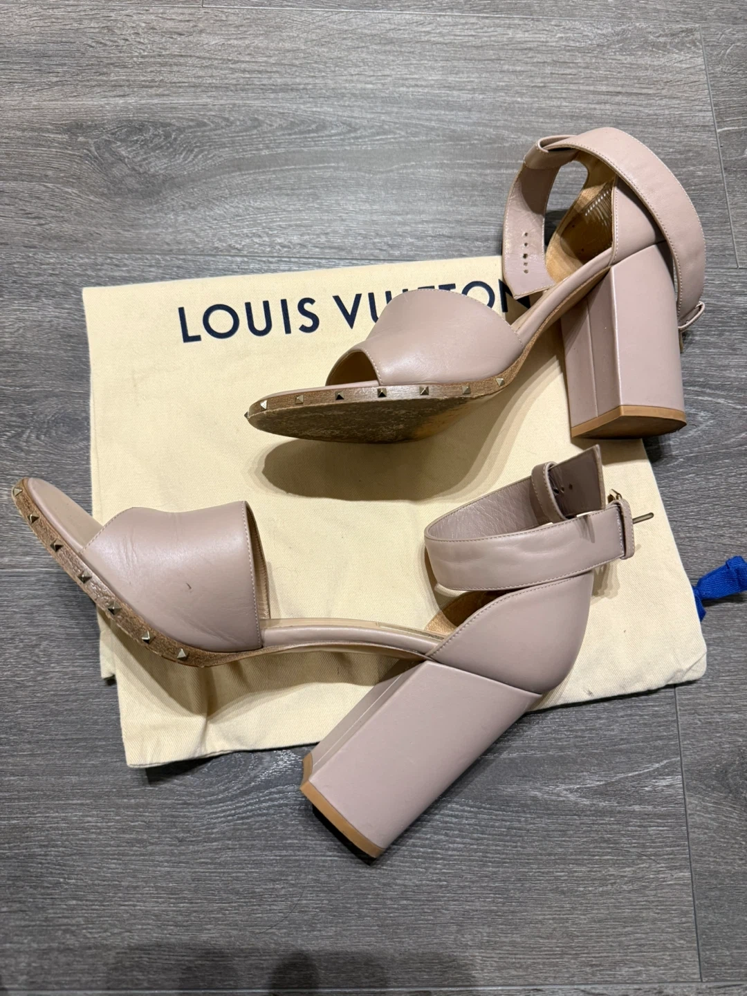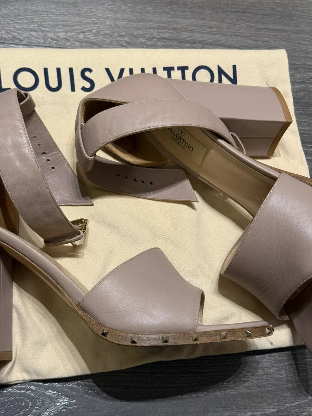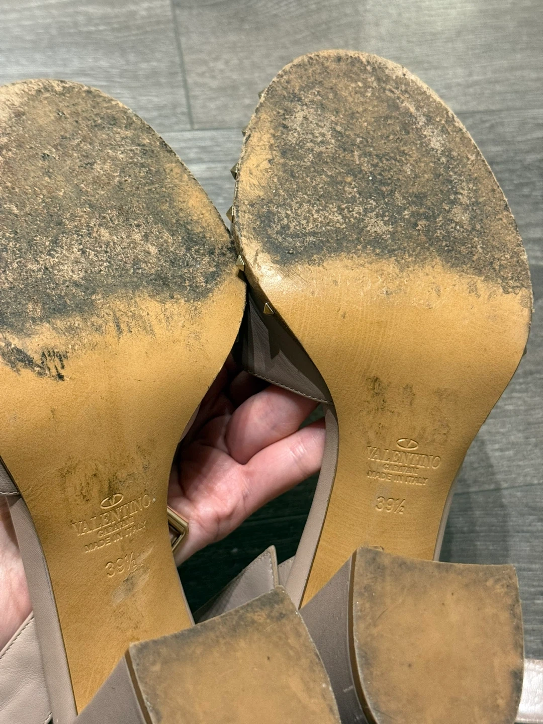 They are a beautiful light pink nude colour and have an ankle strap. They show some signs of wear.