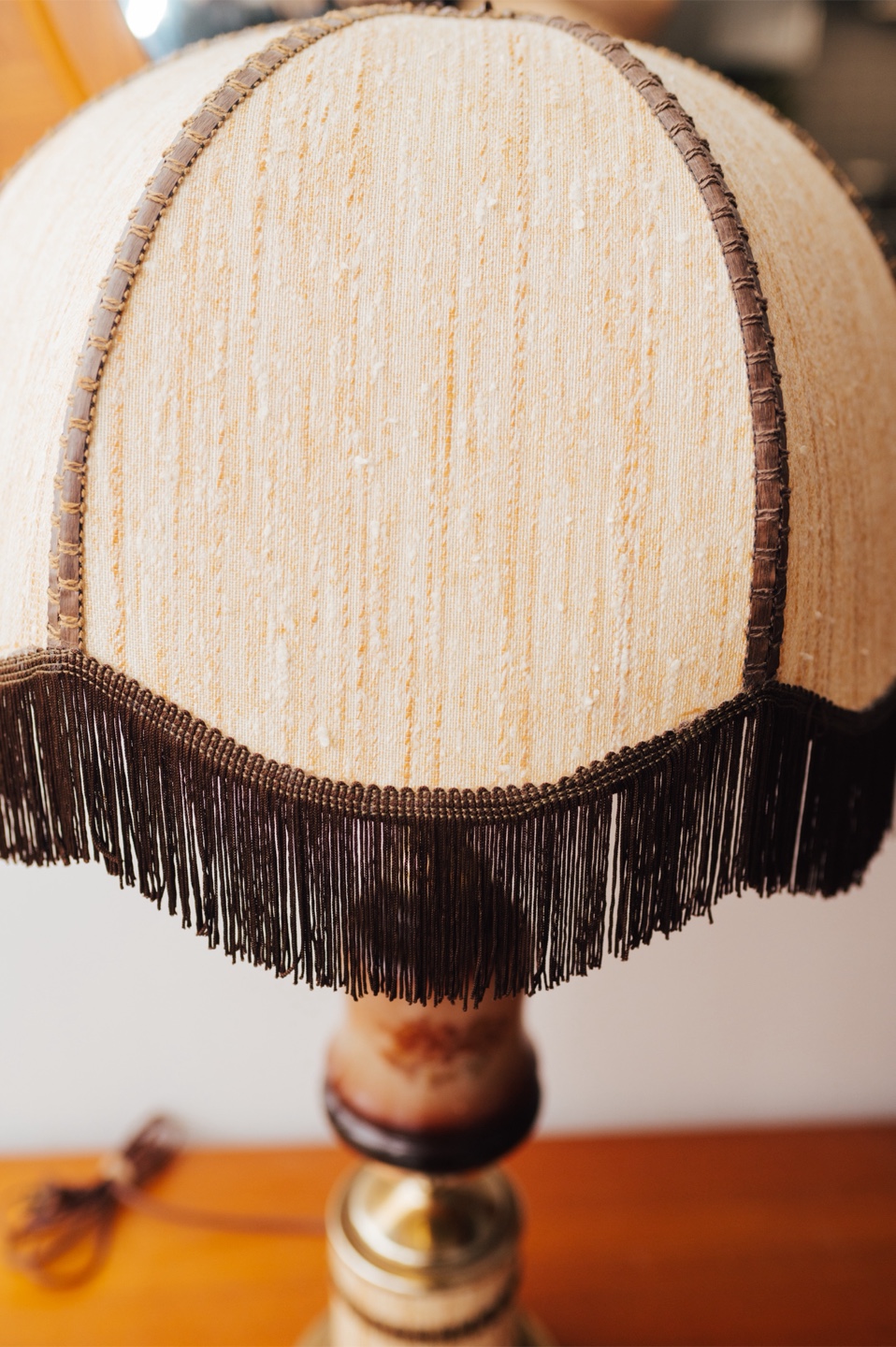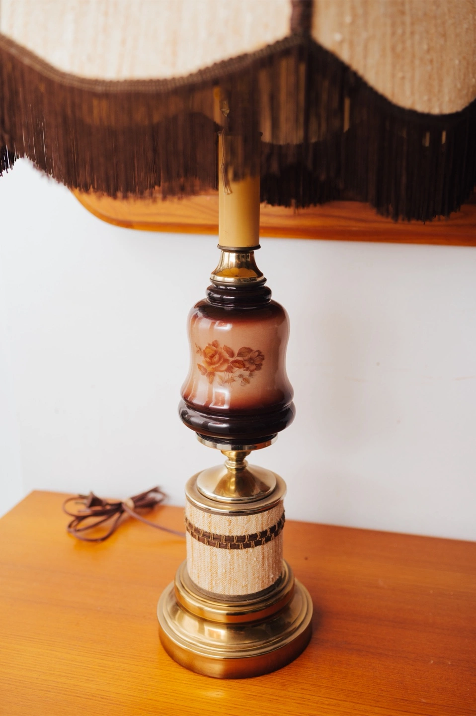 Brass base + hardware, smoked glass body, fabric shade with fringe trimStyle: Retro / Boho / Parlour / Romantic VintageOriginal fabric shade with scalloped paneling + brown fringeStandard bulb socket, working condition
