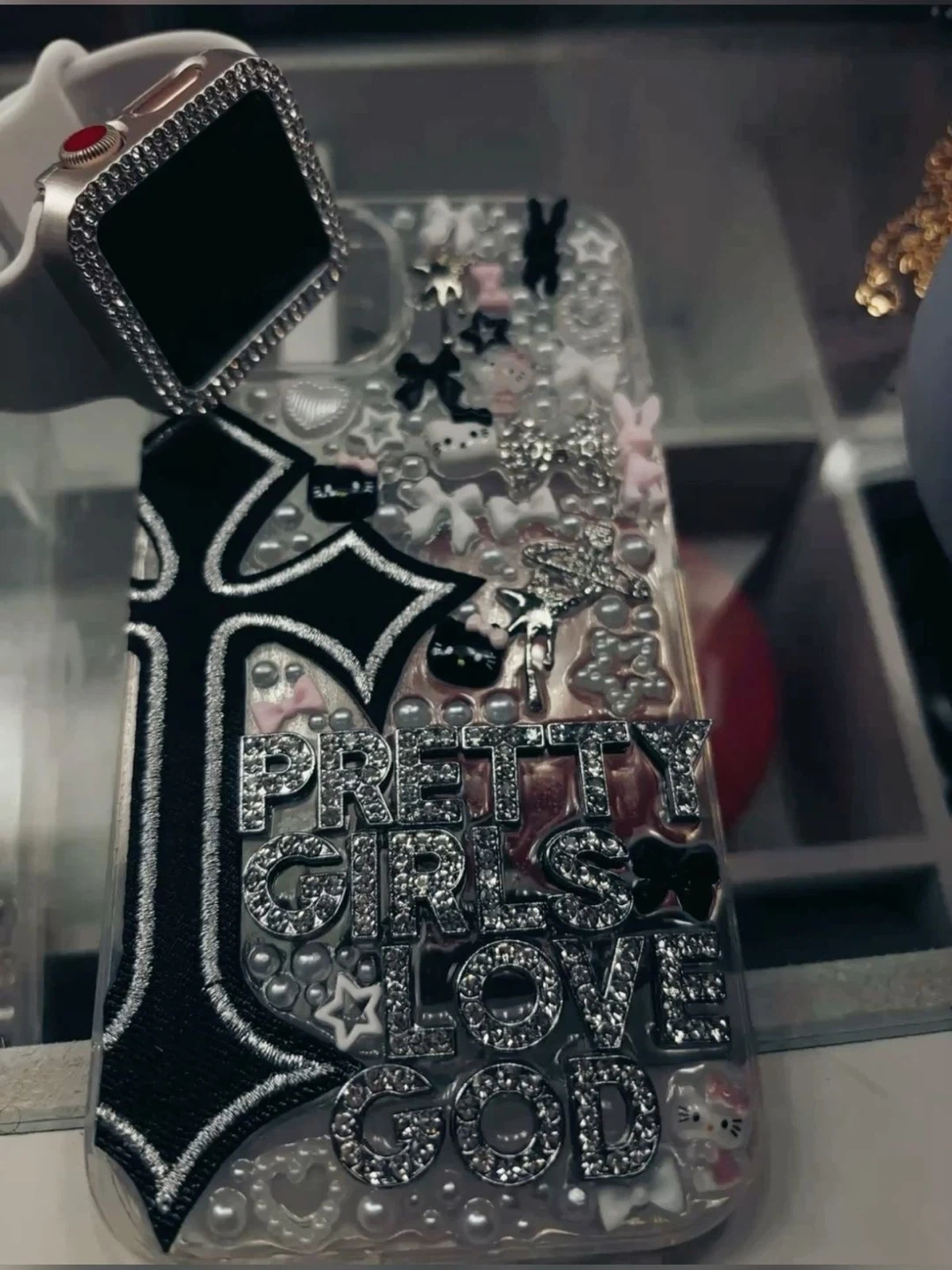 Selling a custom iPhone case that's sure to turn heads! It features a unique design with the words "Pretty Girls Love God" in sparkling letters, along with other embellishments like pearls and cute charms. It's in great condition and ready to add some bling to your phone!