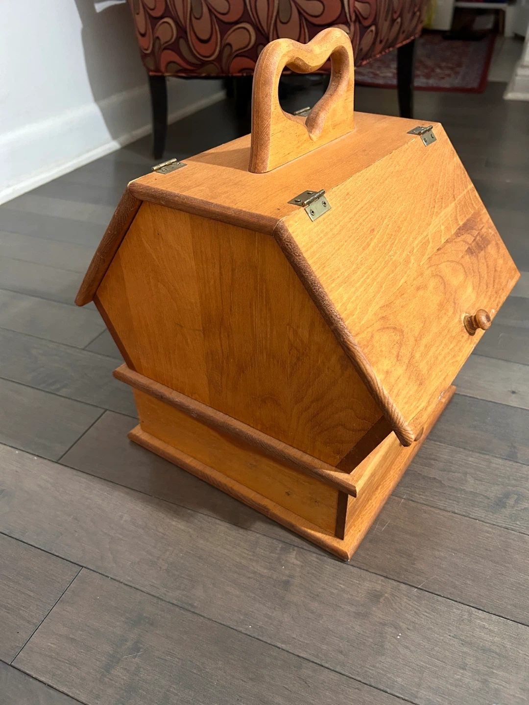 Here's a charming wooden sewing box ready for your next project! It features a convenient handle for easy carrying and drawers to keep your supplies organized. The box is in great shape