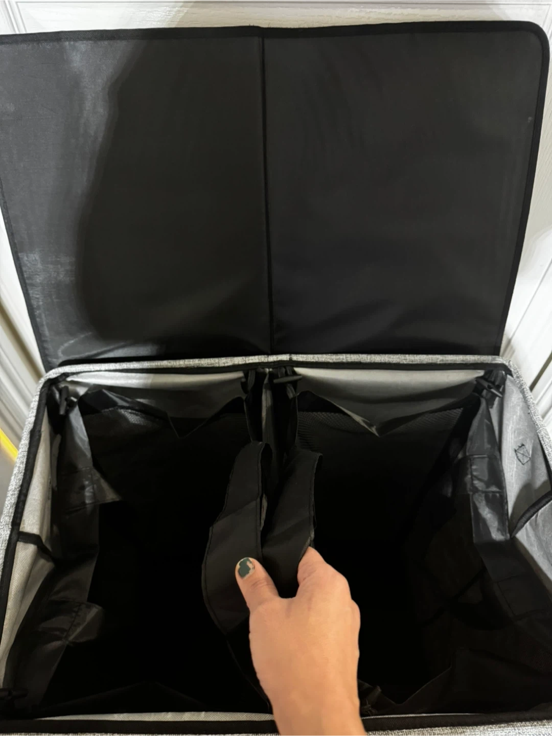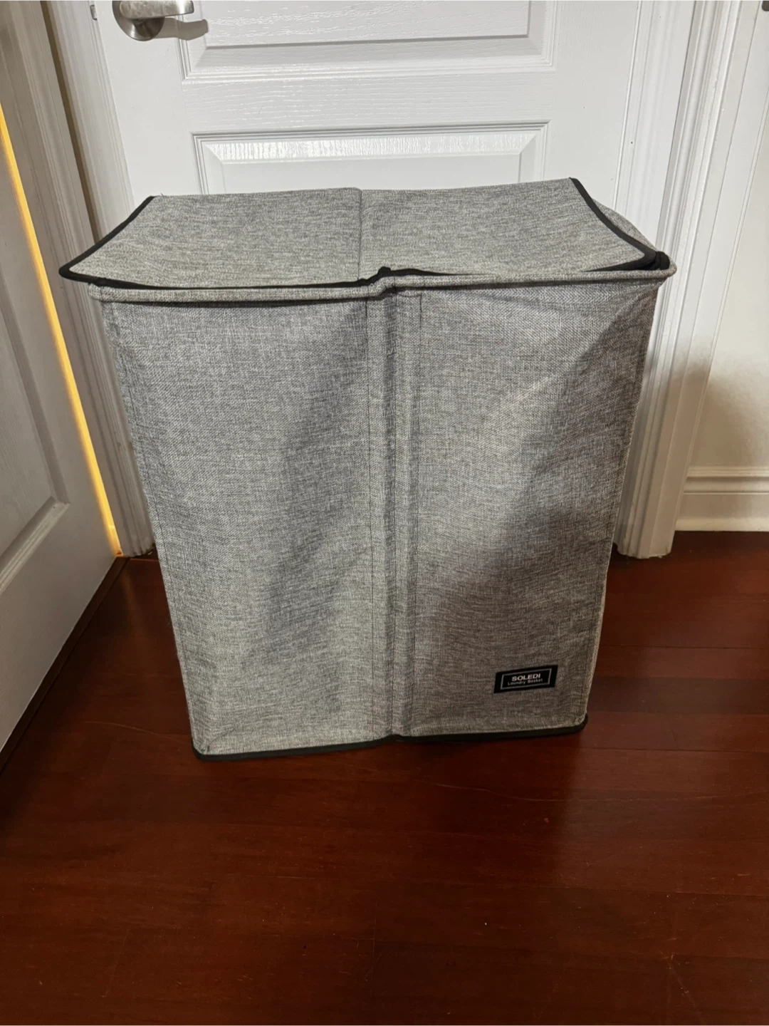 Keep your laundry tidy with this Soledi laundry basket featuring a convenient lid and dual compartments for easy sorting. This laundry basket is in great condition and has been well cared for.