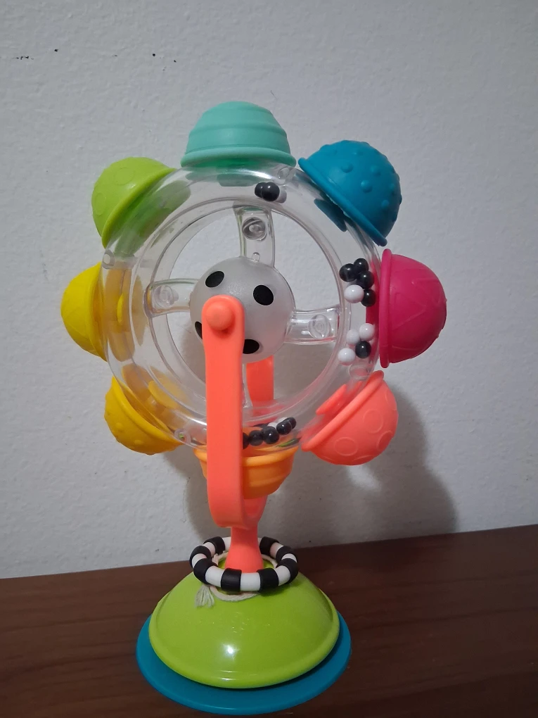Selling a Sassy Suction Wheel toy! It's a colourful and engaging toy for babies. The suction cup base allows it to stick to surfaces, making it great for playtime on high chairs or tables. The spinning wheel and colourful beads provide visual and auditory stimulation for your little one