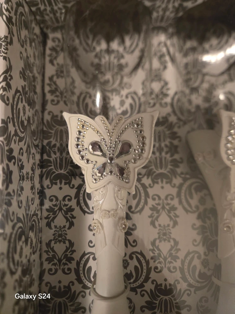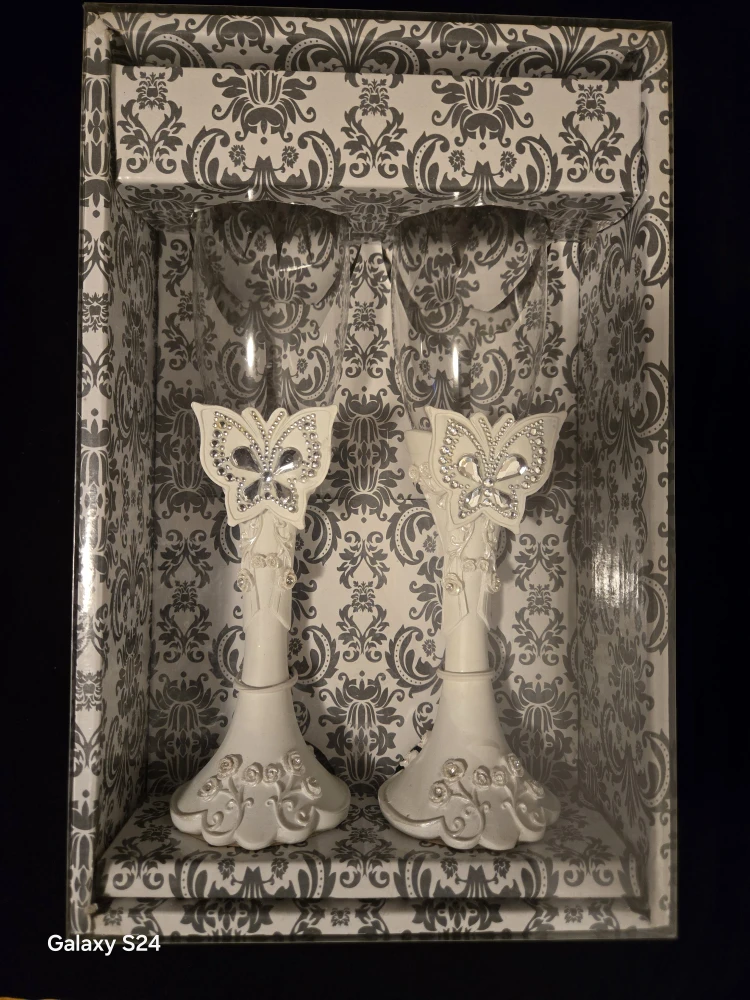 These butterfly wedding champagne flutes are brand new and still in their original box! They're beautifully decorated with rhinestones and a butterfly design, perfect for a special occasion