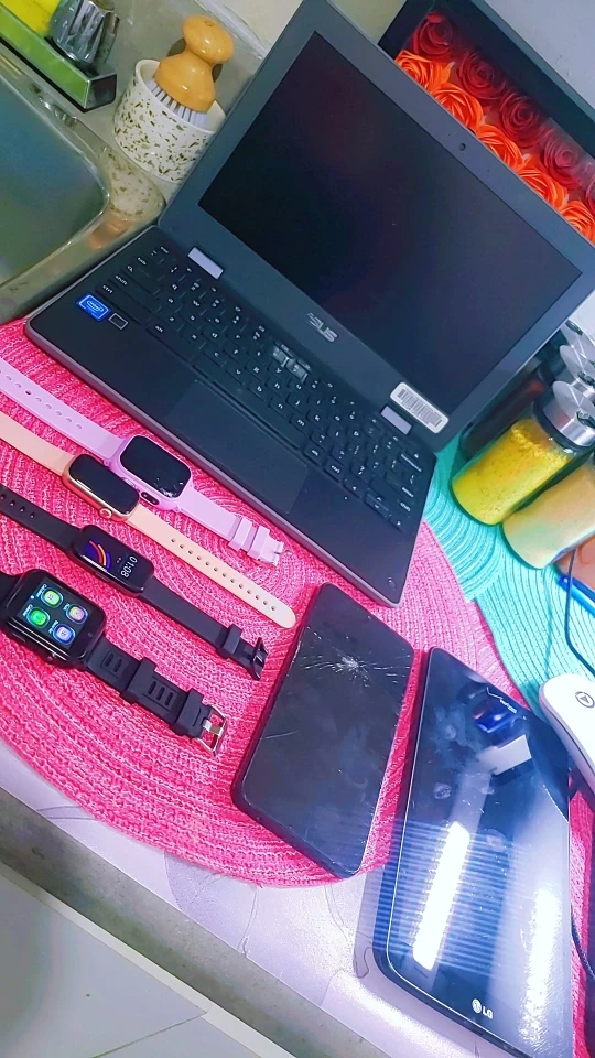 Selling a variety of items including an ASUS Chromebook, several smartwatches in different colors, and a Samsung phone. The phone has a cracked screen, as shown in the pictures. Please take a look at the images for details on each item! Works perfect. 100
