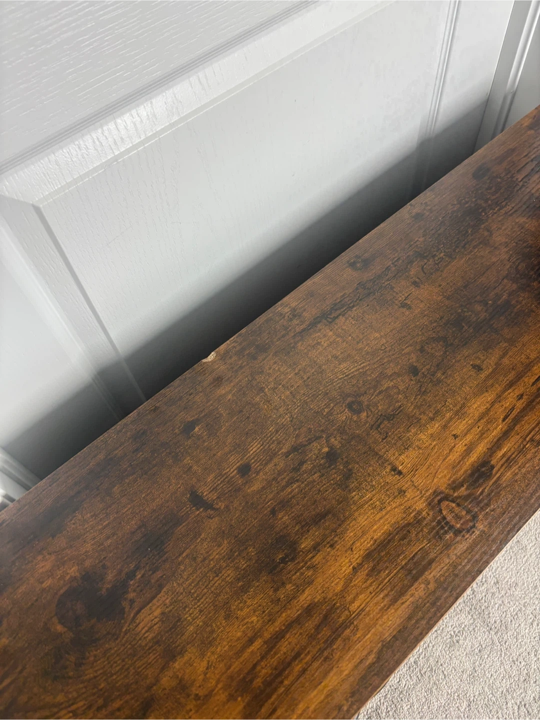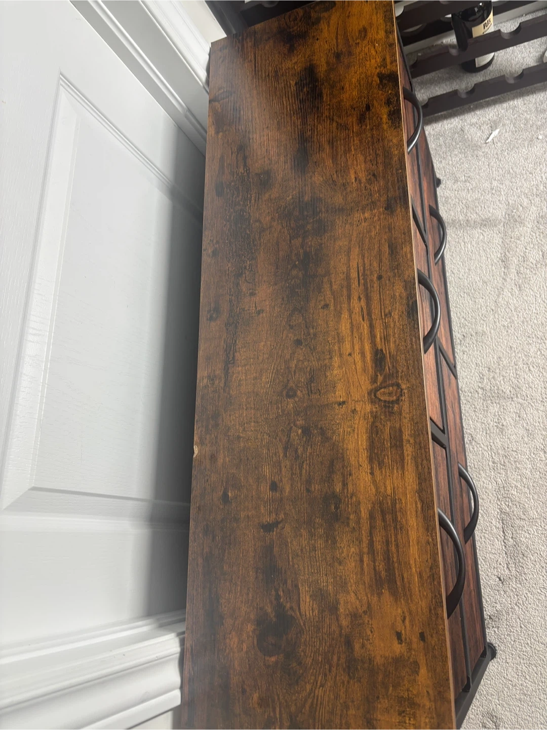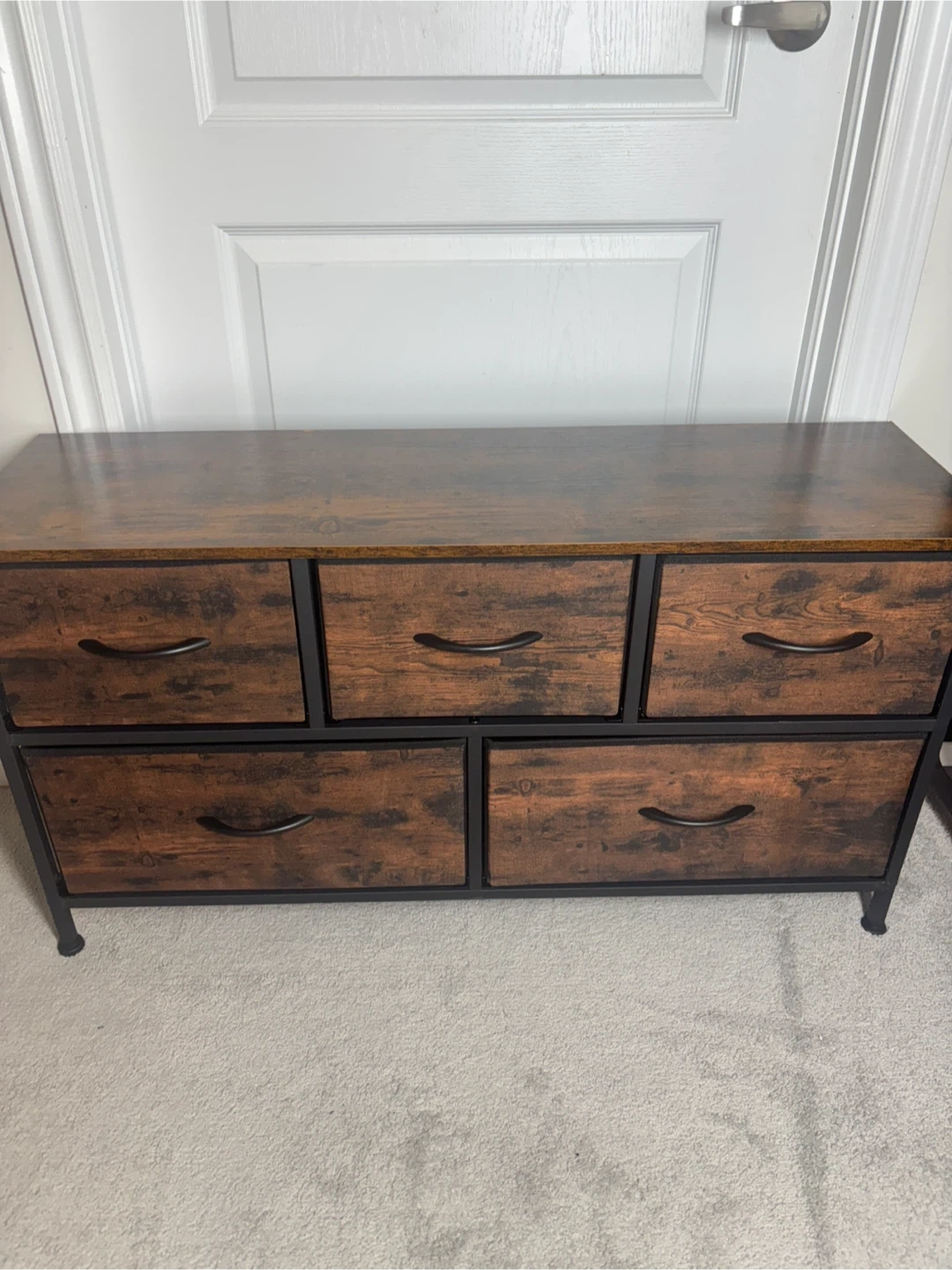 This is a lovely dresser with a wood grain finish and black metal frame. It features five drawers, perfect for organizing your clothes and other items.