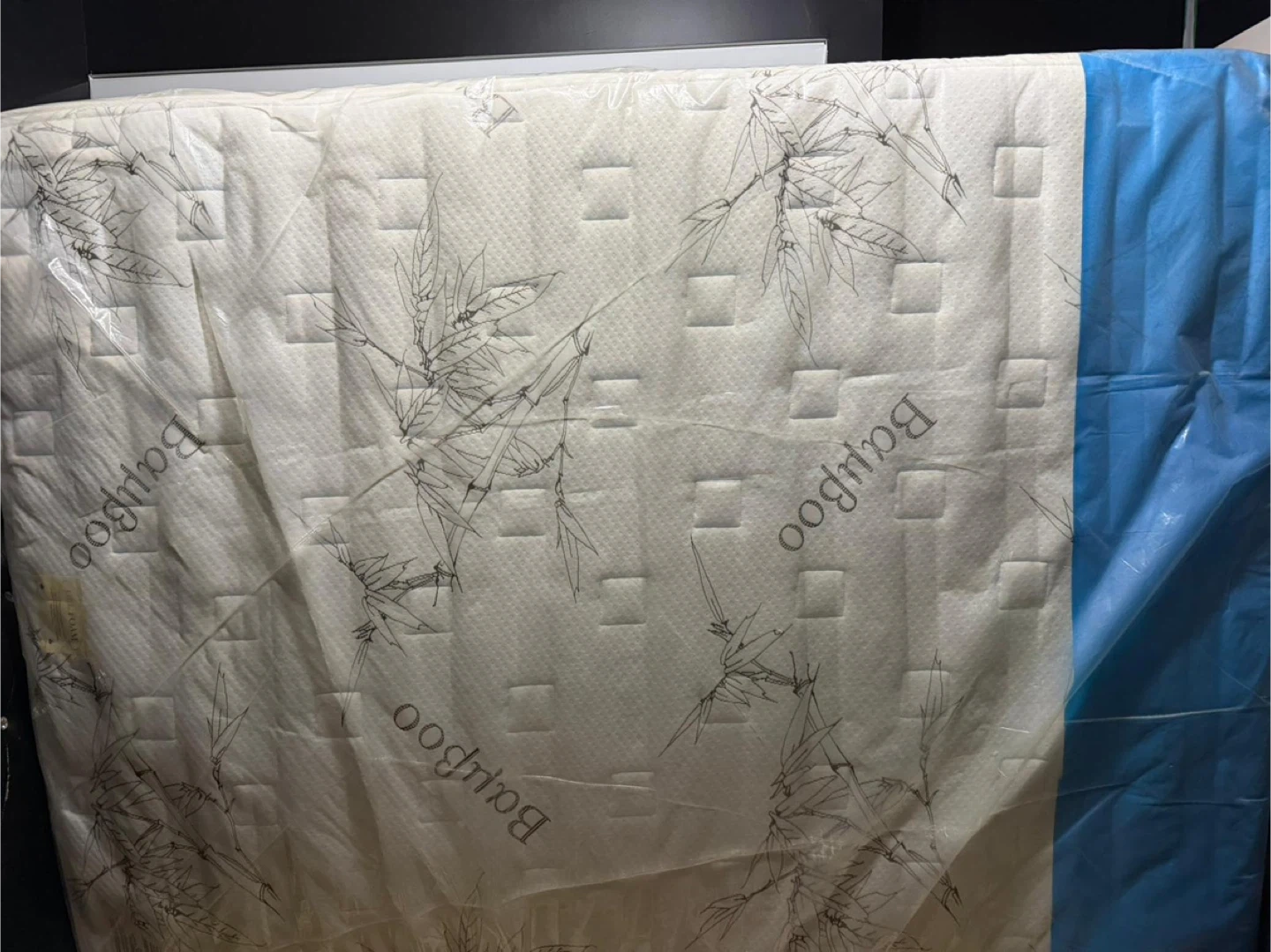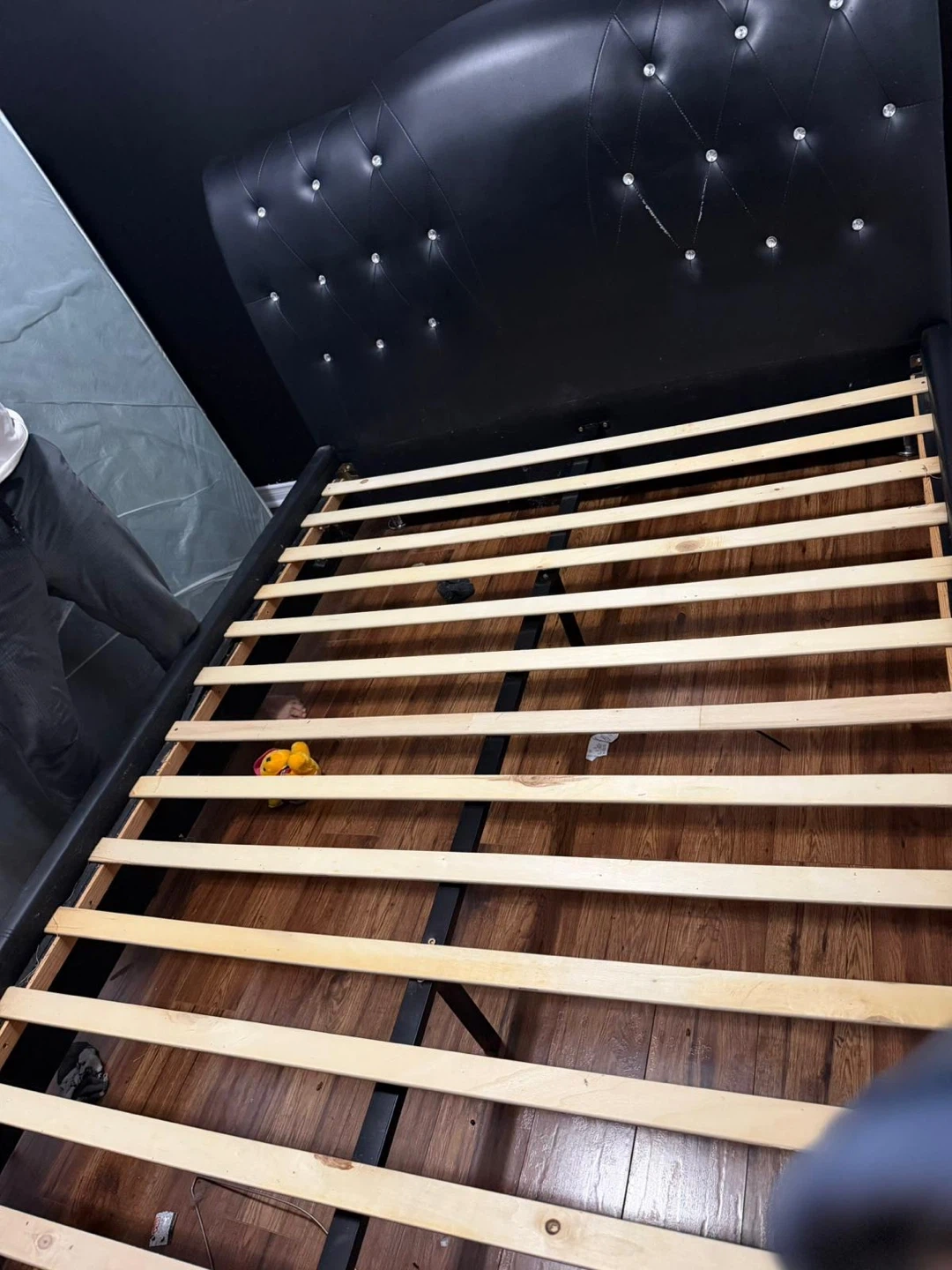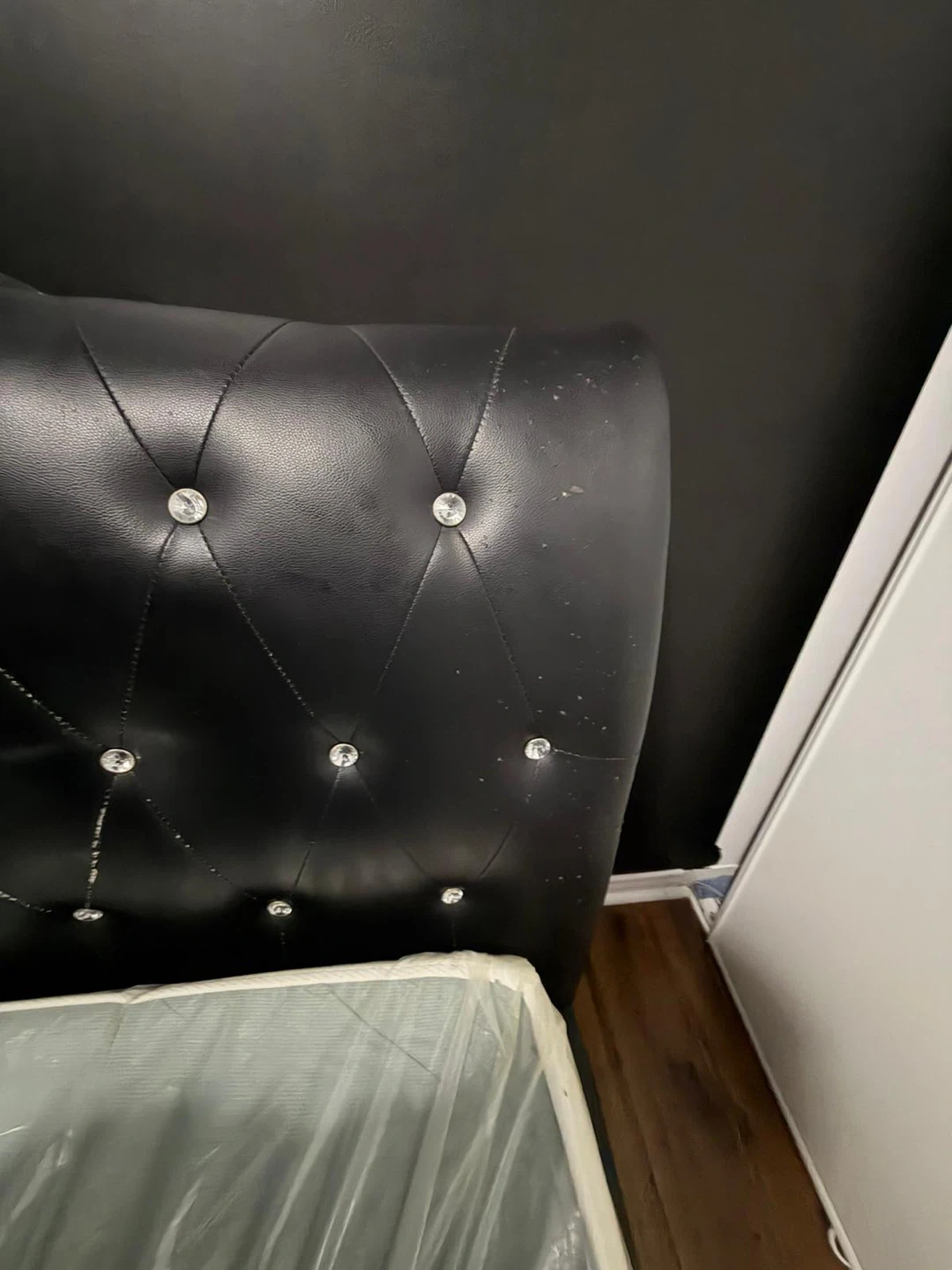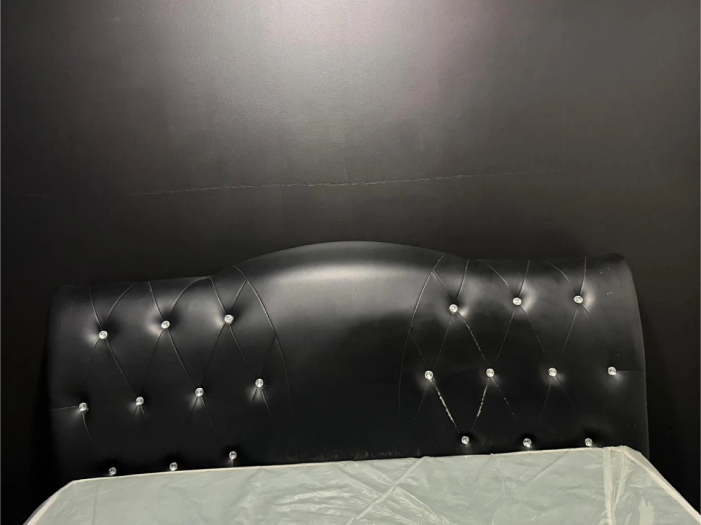 Selling a queen-sized bed frame with a faux leather headboard. It's black with some rhinestone detailing. The bed frame is in good condition and ready for a new home! Brand new queen mattress