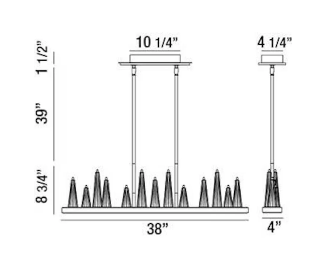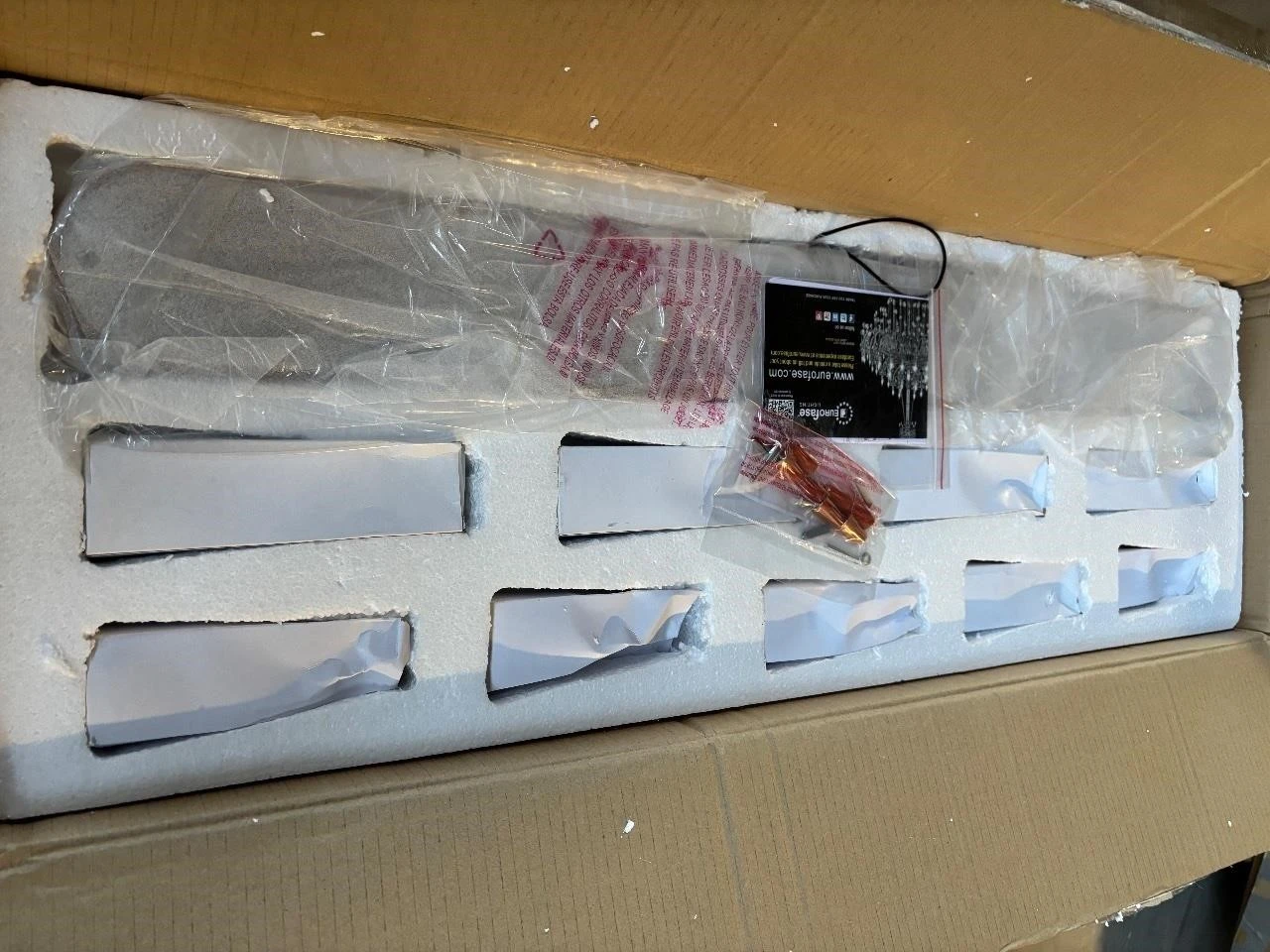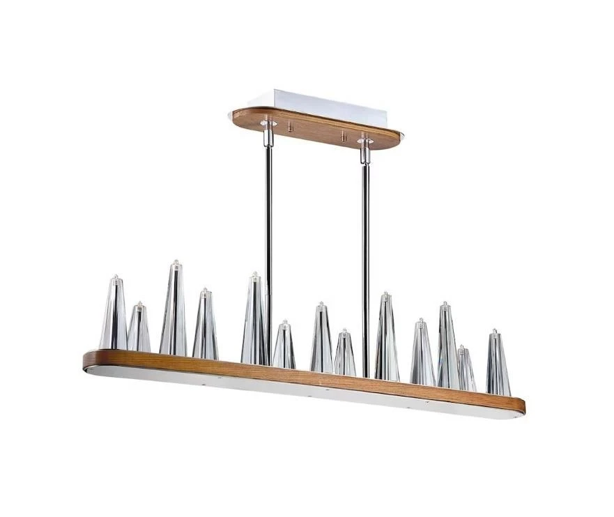 Selling a brand new Eurofase Lighting chandelier, still in its original box! It features a stylish design with chrome accents and a wood finish. The dimensions are approximately 38 inches in length and 8 3/4 inches in height. Perfect for adding a modern touch to any dining room or living space!