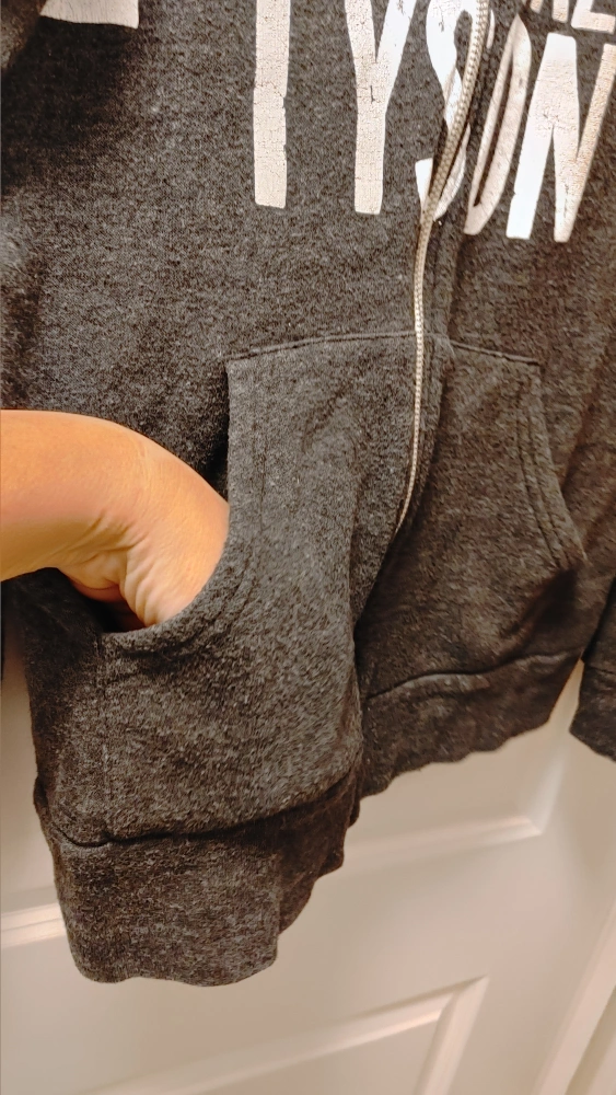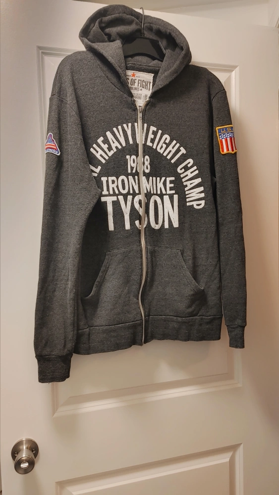 Roots of Fight hoodie featuring Iron Mike Tyson. It's a size XL/TG and made of 55% cotton, 34% polyester, and 11% rayon. Great for any boxing fan!