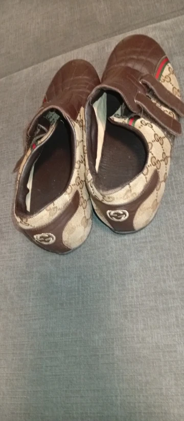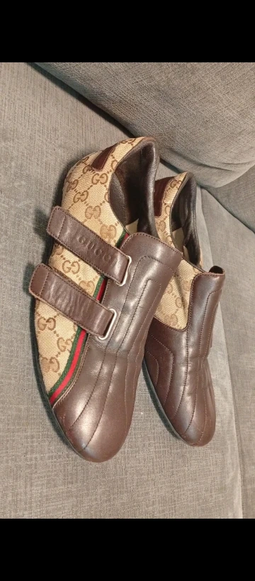 Selling a pair of Gucci shoes in brown leather and canvas. They have a unique design with the Gucci logo subtly patterned on the canvas parts. The shoes feature a leather upper and velcro straps for closure. They are in used condition, so please check the pictures for details!