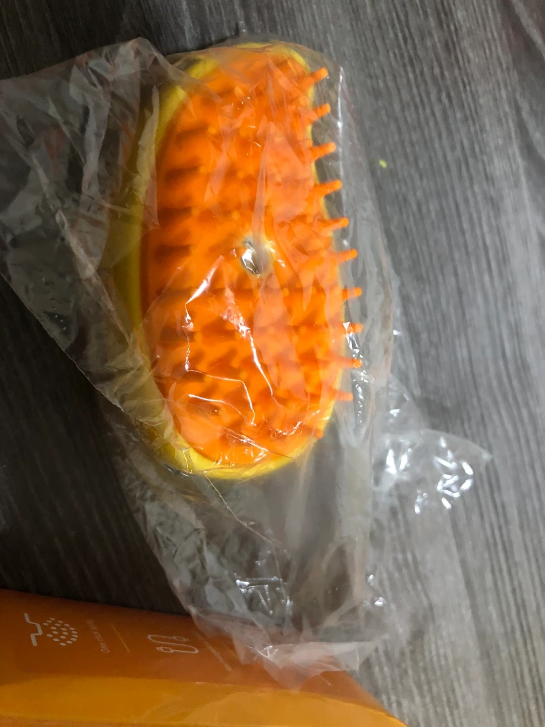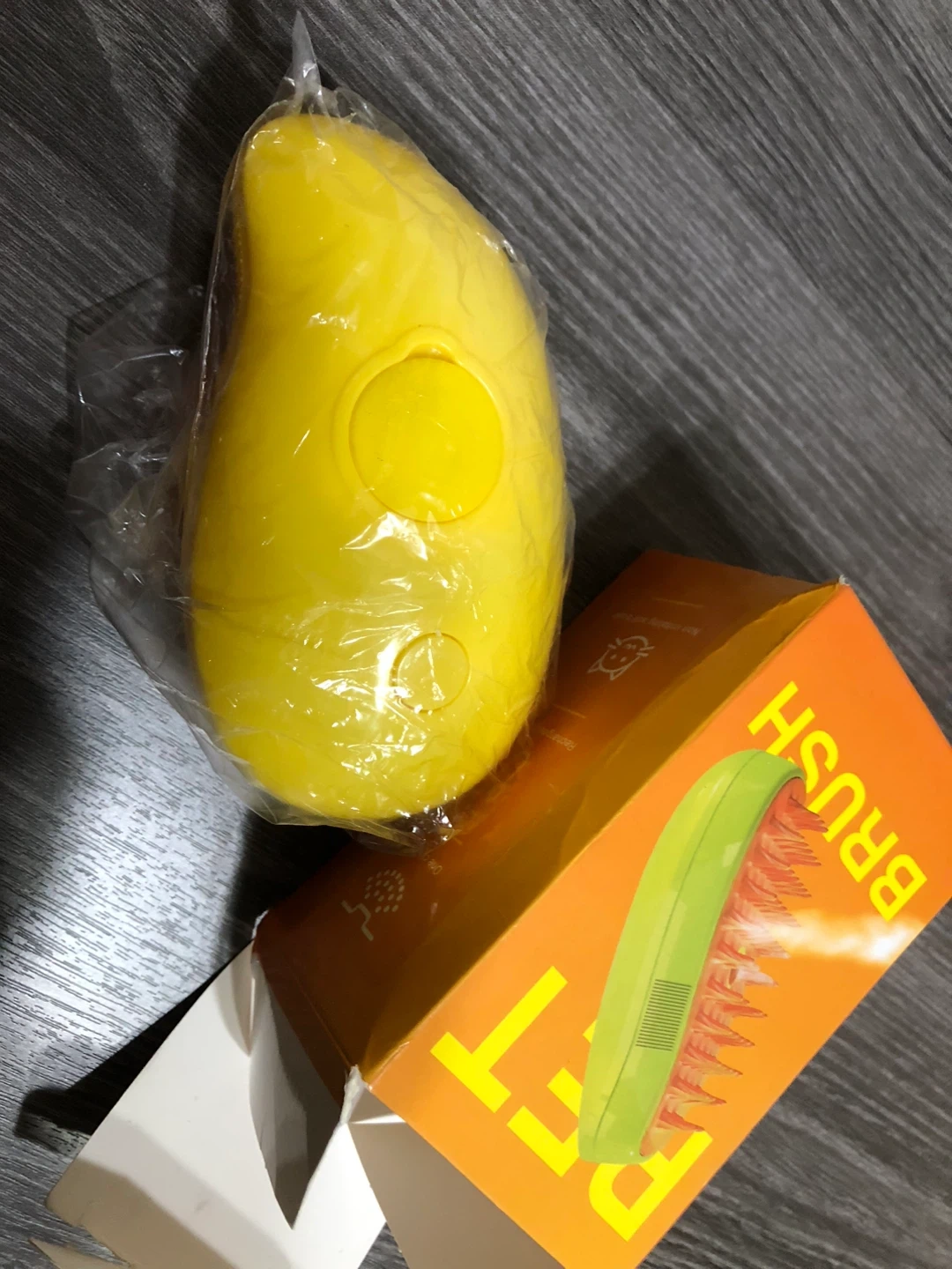 I'm selling a brand new pet brush! It's a non-irritating soft brush with a one-click spray function and a rechargeable design. It comes with the box and charger