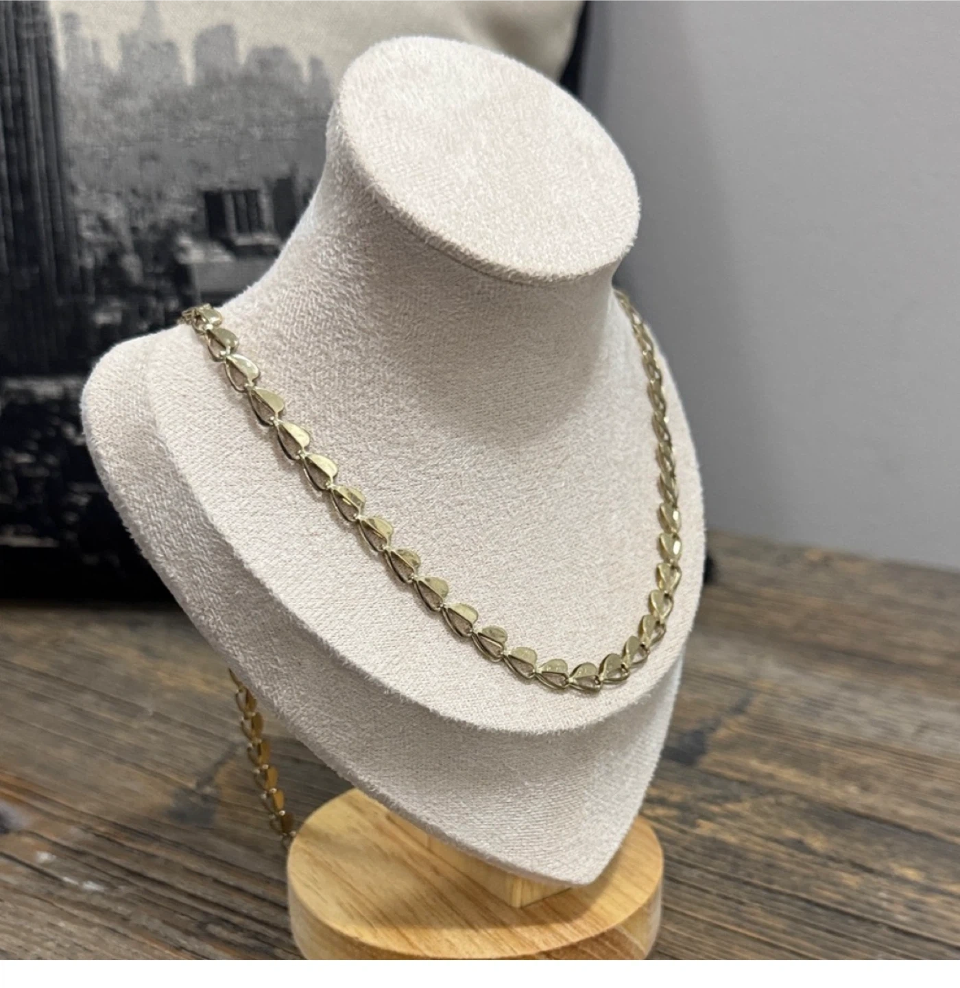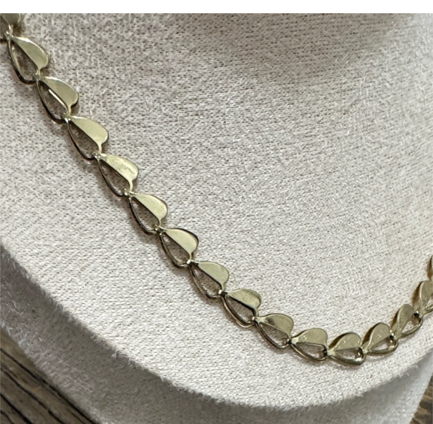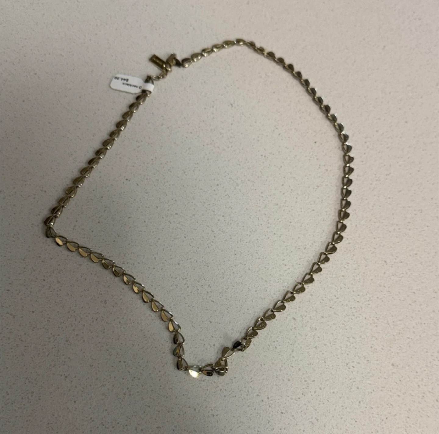 Gold tone. Half solid half wmpty heart link necklace. Has scratching reflective in price. No box or duster