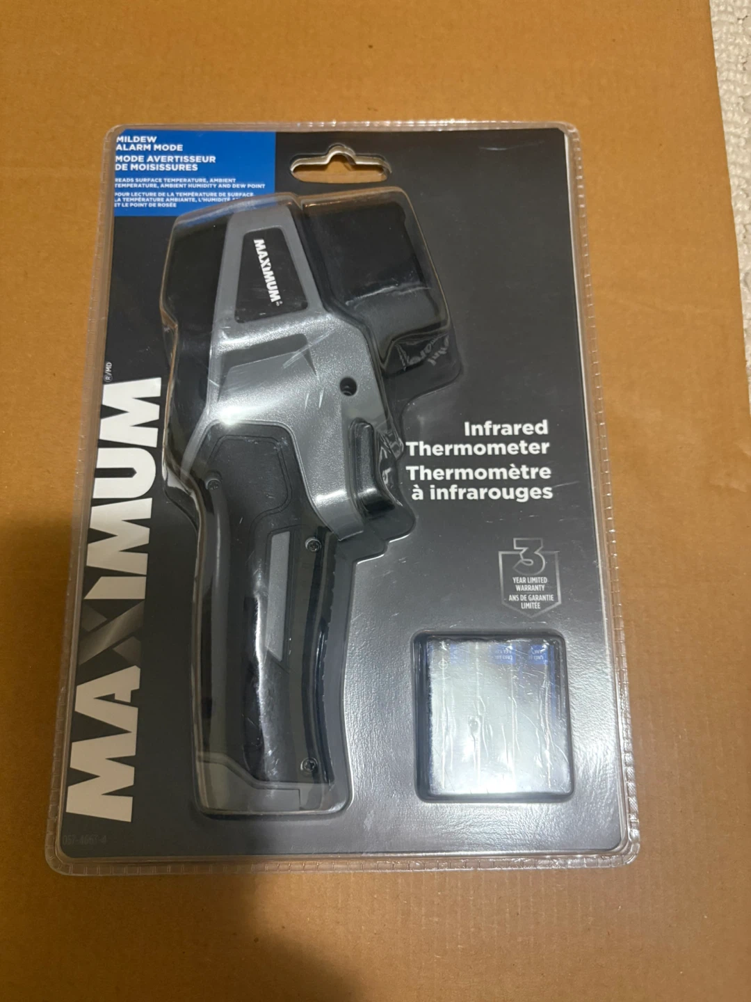 Selling a brand new and unopened package MAXIMUM No-Contact Infrared Thermometer with Mildew Alarm. It's still in its original packaging and ready to go!