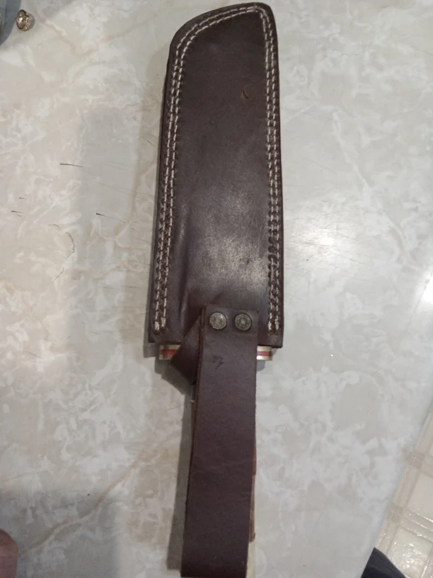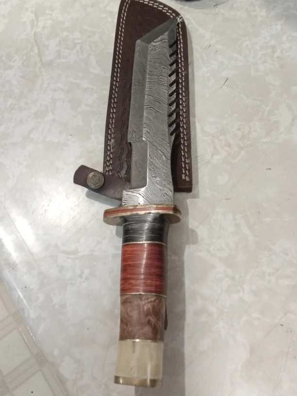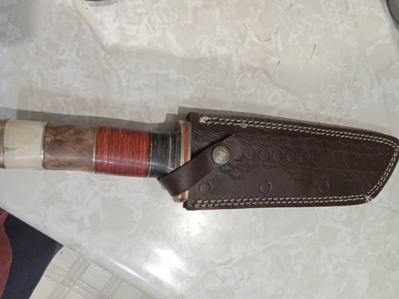 Here's a handmade Damascus steel knife, complete with a leather sheath. The handle is a mix of wood and bone, giving it a unique look. It's in good condition and ready for a new owner!